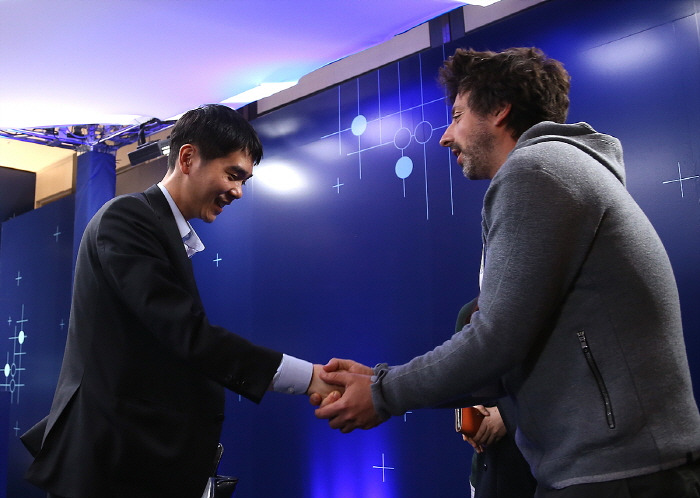 최근 이세돌과 알파고의 대국에서 이세돌이 승을 거뒀을 때 화제가 된 또 하나의 사진이다. 구글 창업자인 세르게이 브린이 수수하게 차려입고 겸손한 자세로 이세돌의 손을 맞잡은 사진이다. 만약 국내 대기업에서 유사한 이벤트를 열고 시상을 하면 어떤 모습이었을까?