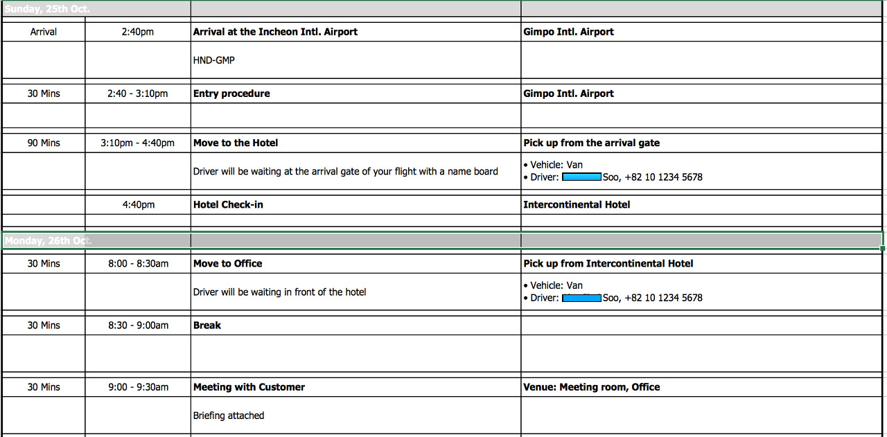 흔히 Itinerary라고 부르는 여정표다. 공항에 도착해서 호텔까지 픽업할 차량과 운전사부터 30분 단위로 미팅 등의 일정이 빼곡히 적혀있다. 이렇게 보면 아, 외국 회사들도 의전 엄청 챙기는구나 하고 생각할 수도 있다.