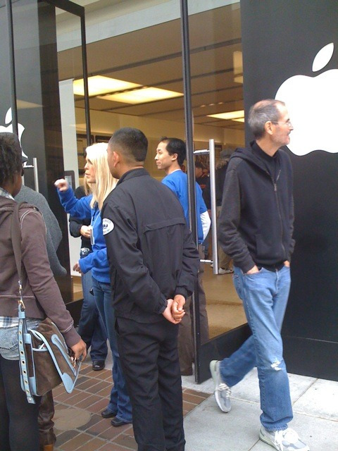 2010년 아이패드가 발매되는 날 미국 팔로 알토 Palo Alto에 있는 애플 스토어에 들렀다 포착된 스티브 잡스. 찢어진 청바지에 후드티를 입고 혼자 나오는 모습에서 쿨함이 그냥 뚝뚝 묻어 나왔다. 한국 대기업의 회장이 매장을 방문할 때 어떤 일이 벌어졌는지와 비교하는 사진이 한참 나돌았었다.