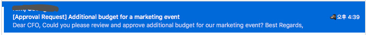 꼭 수신자가 해줘야 할 일이 있으면 제목 헤더에 따로 써주기도 한다. 제목만 보고도 어떤 업무가 필요한 지 알 수 있도록 [Approval Request] 같이. - "빨리 결제해주세요. 현기증 난단 말이에요."라고 해석된다.