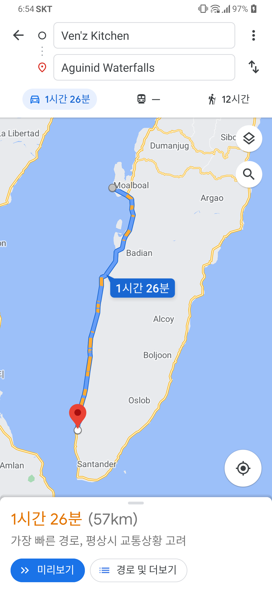 이미 사위가 어둑해지기 시작했기에 풍광을 즐기지 않고 열심히 달렸다. 가는 길에 수밀론섬과 섬으로 들어가는 배를 탈 수 있는 곳을 확인했다. (난 아마도 안 가지 싶지만.) 좀 더 가니 오슬롭 웨일샤크 와칭하는 곳이 보인다. 오키. 대충 확인했고 조그만 마을을 지나고 숙소에 도착했다. 숙소는 길 오른쪽에 위치해 있었고 초행길엔 특히, 어두워진 저녁엔 찾기 쉽지 않을 듯하다. 그래도 운 좋게 한 번에 찾아서 안전하게 도착했다. 체크인을 하고 영민 누나에게 도착했음을 알렸다.