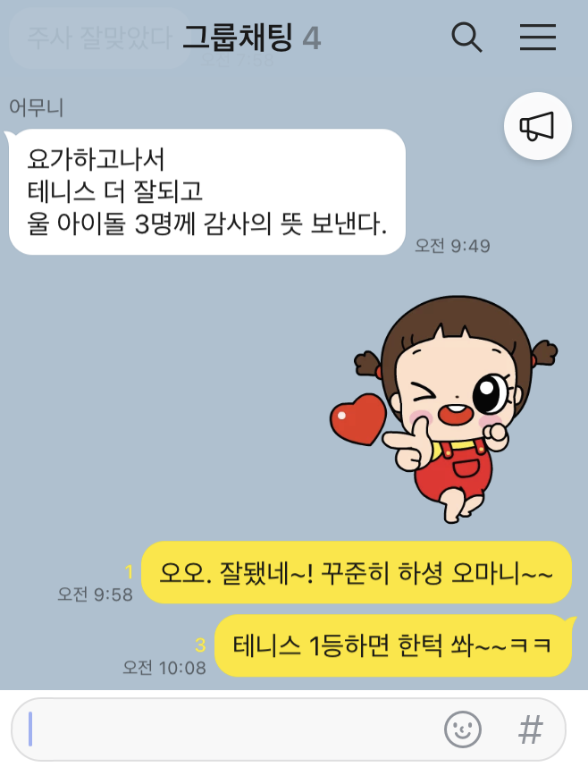 그리고 8년이 흘렀다. 작년 9월에 3년간 정직원으로 잘 다니던 회사를 그만두고 개인사업자로 온라인 스토어를 시작했고, 동시에 내 인생의 두 번째 스승인 법화 스님이 30년째 운영 중인 윤주영 명상요가센터에서 지도자로 합류하게 되었다. 수업을 시작한 지 3개월이 되면서 지나에게 나와 동생들은 온라인 3개월 수강권을 선물했고, 3주 정도 지나서 지나는 가족 단톡 방에 이런 글을 남겼다.