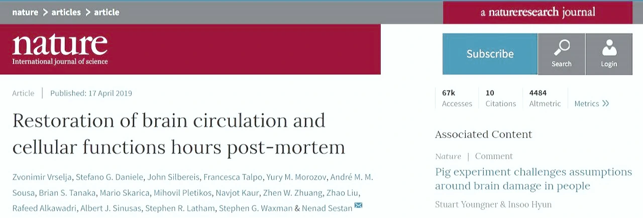지난 4월 학술지 <네이처>에는 '사망 수 시간 후 뇌 순환 및 신경 기능의 회복(Restoration of brain circulation and cellular functions hours post-mortem)'이라는 논문이 실렸다. 도축장에서 잡은 돼지 뇌가 실험실에서 회복하는 기색을 보였다는 내용이다. 한국 언론에서도 죽은 뇌를 살렸다는 기사를 냈다.
