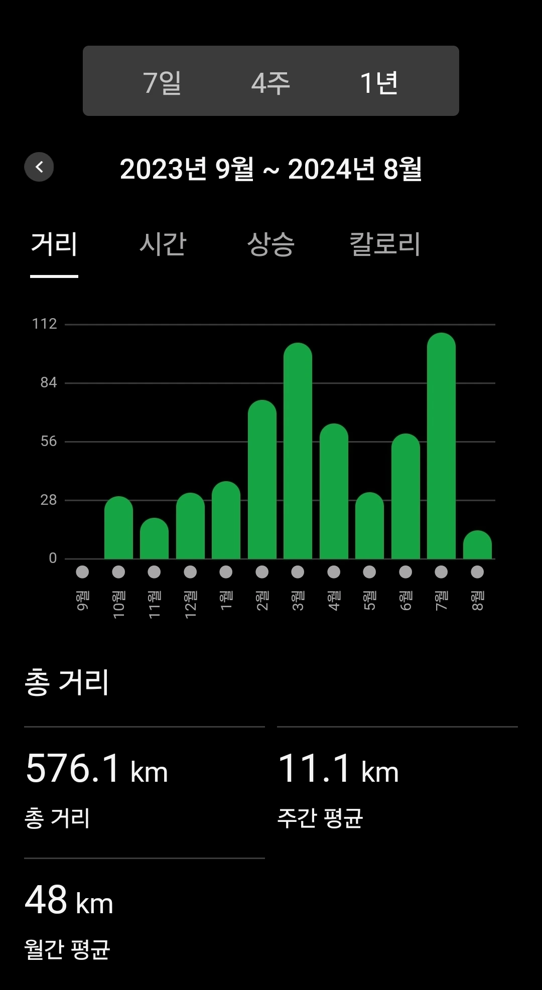 하프라마톤이 있던 3월에 제일 많이 달렸고, 부상이 심했던 5월은 철인대회 당일 외에는 거의 뛰지 못했다.한번에 4km 뛰는 데에서 시작해 킬로수를 점점 늘렸다. 회사 근처에서 찾을만한 코스 중 제일 긴 7km까지 달릴 수 있었다. 그러다가 다쳤다. 기억에는 7월 중순에 있던 롯데 아쿠아슬론에서 다친 것 같다. 석촌호수 1.5km를 수영하고 롯데타워 계단을 오르는 행사였다. 아쿠아슬론 다으부터 다리의 느낌이 이상했다. 근육통이라기에는 아무리 지나도 낫지 않아 병원을 갔다. 내가 아픈 부분을 보더니 x-ray나 초음파도 없이 신스플린트 진단을 받았다. 나아졌다고 다시 뛰면 다시 도지는 부상이라기에(운동 부상 중 안 그런 건 없다) 달리고 싶은 마음을 참고 쉬고 있다. 원래 달리던 시간엔 다시 자전거를 탔다. 회사에서 어영부영 시간을 보내고 야간 라이딩을 한다. 항상 하던 수영도 약간 늘렸다.