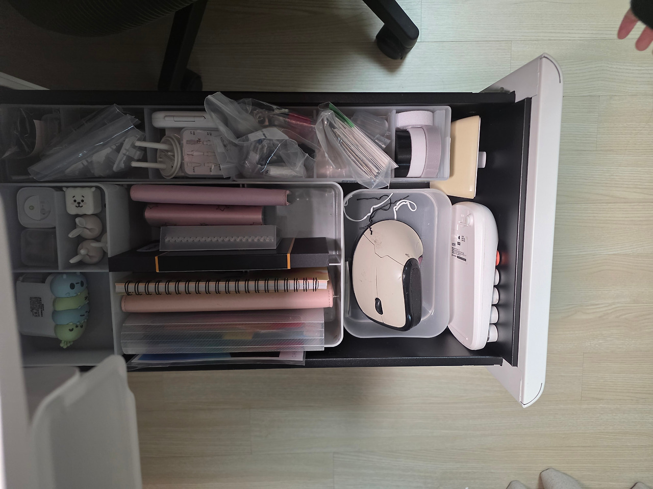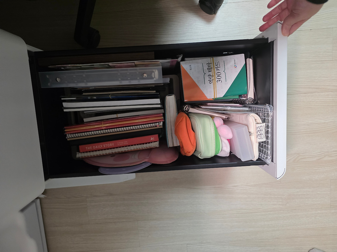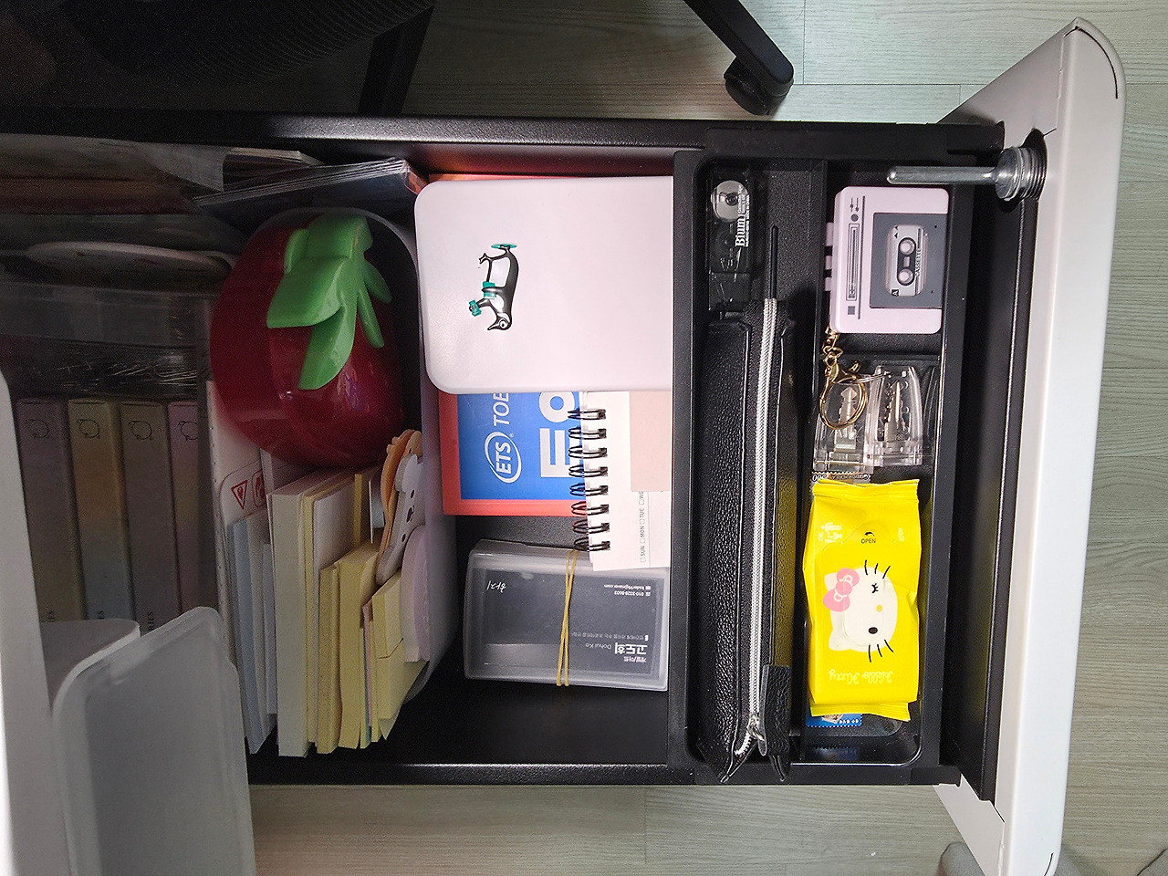 원래 내 책상은 모션데스크고, 책상서랍이 따로 구비되어있지 않아서 책상 위에 물건이 많았고, 책상 위의 수납함에서 감당이 안되는 물건은 리빙박스에 물건들을 담아 보관하고 있었다. 이번에 새로 책상서랍을 장만해 리빙박스의 물건 중 필요없는 것은 처분하고 필요한 건 책상 서랍속으로 옮겨두었다.