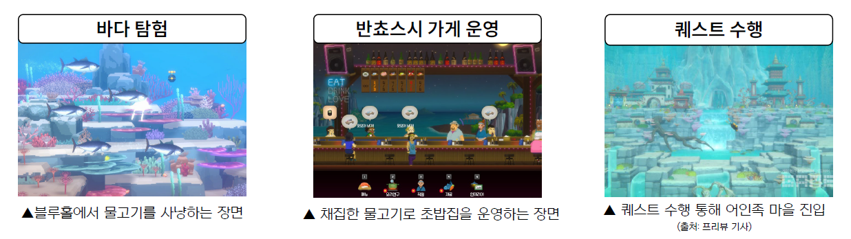 직접 플레이해보면 알겠지만, 이 게임은 재미의 본질에 충실하다. 낮에는 바닷속을 탐험하면서 물고기 잡고, 밤에는 그걸로 초밥집 운영하는 루프가 중독성이 있다. 두 장르가 이질적인 것 같은데, 주인공 데이브를 중심으로 자연스럽게 연결된다.
