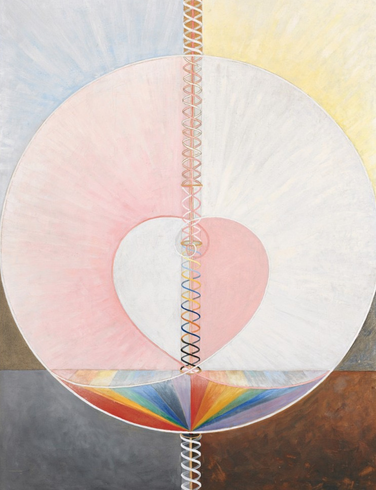 한 : 그녀의 작품들을 보면요. 상당히 영적인 부분에 관심이 많았다는 걸 알 수 있는데요. 초기 작품들은 풍경화나 초상화가 대부분이고요. 1880년 여동생의 죽음을 기점으로 작품스타일이 바뀌기 시작합니다. 그때부터 영적인 부분이 그림에 나타나기 시작하는데요. 특히, 1906년부터 1920년까지 열 점의 대형 연작이 그녀 그림의 전성기라고 볼 수 있어요. 형상들이 화가가 그릴 수 있는 것보다 더 빨리 머릿속에 떠올랐다고 합니다. 심지어 커다란 캔버스에 달걀노른자를 섞은 템페라 물감으로 큰 붓을 이용하는 등 다른 재료와 방식을 이용해 그리기도 해요.