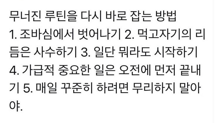 5번 매일 꾸준히 하려면 무리하지 말기 : '무리'의 규정을 내려야겠다. 대충이 무리는 아니다. 무리하지 않는다는 것은 할 일을 안 하고 대충 뭉갠다가 아니다. 어렵다. 하지만 조사해 봐야겠다.