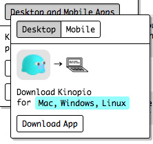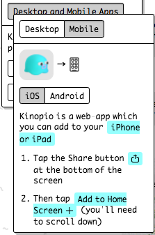 Kinopio에서는 PC와 노트북 환경에서 사용을 위한 설치형 프로그램 이외에 모바일 환경도 지원합니다(가운데 이미지는 Mac OSX에서의 설치된 애플리케이션 예시). 모바일의 경우, Native App이 아닌 Web App을 지원한다는 점에서는 아쉽지만, Kinopio를 PC환경 이외에 모바일에서도 원활하게 접속하고 사용할 수 있다는 점에서 최소한의 편의성을 제공하고 있습니다.