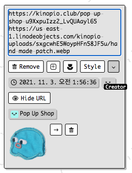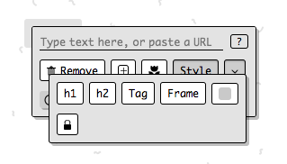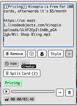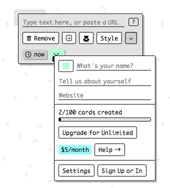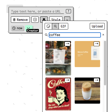 보드에 정보나 자료를 추가하는 단위는 카드(card)입니다. 보드에 카드 추가가 필요한 영역에 마우스를 클릭하면 카드를 추가할 수 있는 창이 표시됩니다. 카드 관련해서는 5개의 메뉴 항목들이 지원됩니다. “Remove”는 카드 삭제, 네모칸에 +로 표시된 메뉴 항목은 체크박스 추가, “꽃 모양”은 다양한 giphy기반의 이미지 추가, “Style”은 포맷 - 헤드라인, tag추가, 카드 프레임 장식 이미지, 프레임 장식 색상, “v”는 작성 시간과 작성자 표시등이 가능합니다.