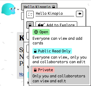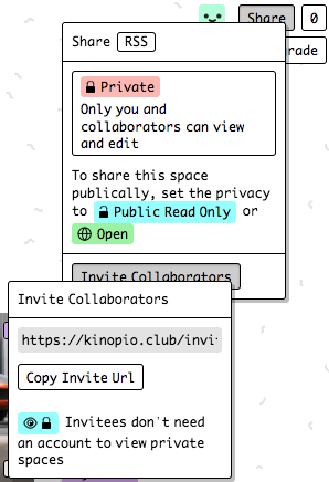 만든 보드(space)를 공유하는 방식은 크게 Open, Public, Private의 3가지 모드가 지원됩니다. Kinopio아이콘 옆의 이름을 클릭하면 아래와 같이 공유 여부를 설정할 수 있습니다. 이 설정에 맞추어 보드의 오른쪽 상단의 “Share”버튼을 통해 외부 공유가 가능합니다. Private의 경우, Invite URL을 통해 공유할 대상자만 해당 보드를 보고 편집할 수 있게 됩니다.