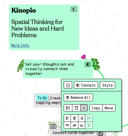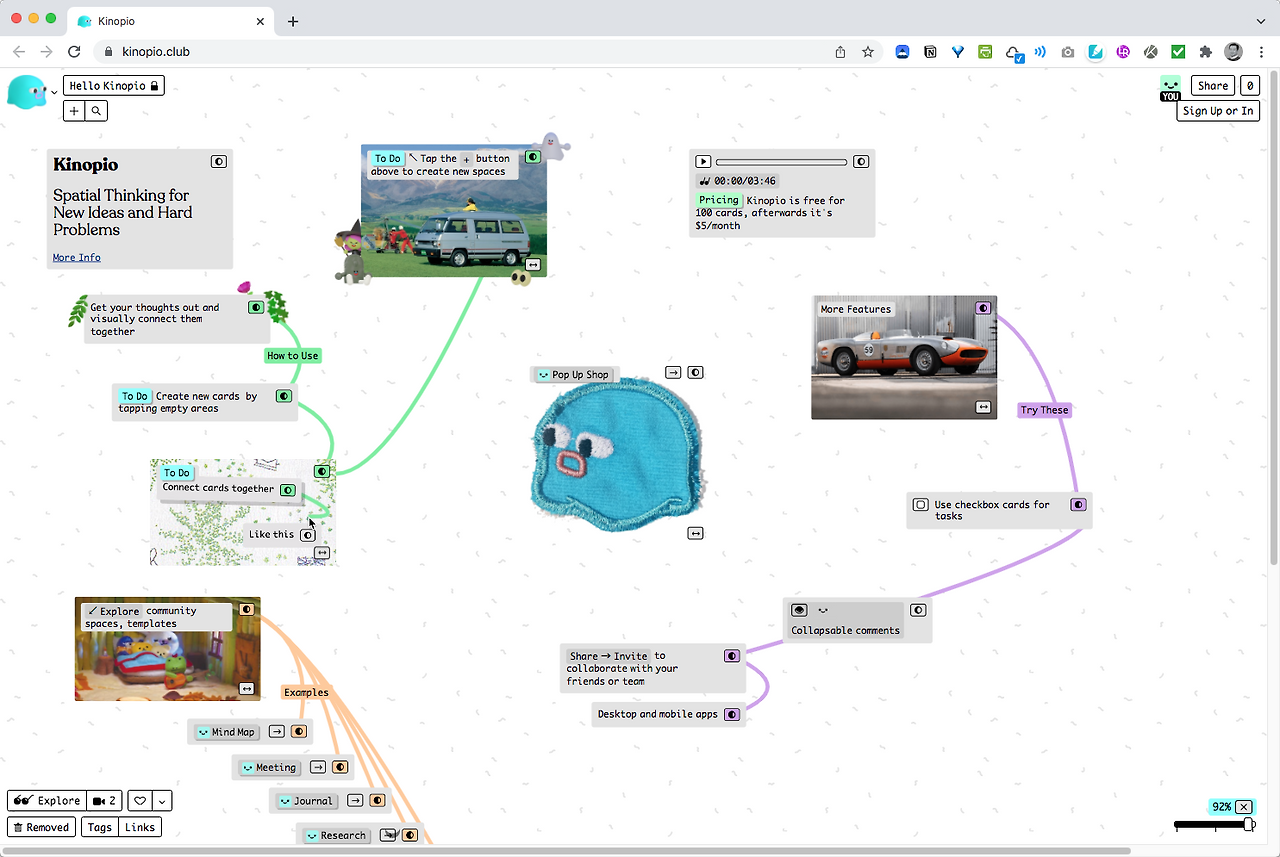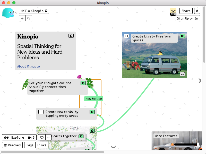 Kinopio의 주요 기능들을 살펴보면 다음과 같습니다.