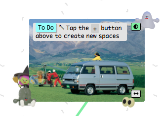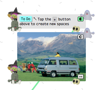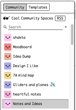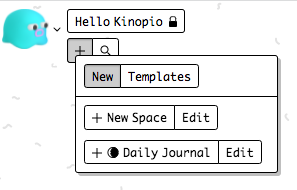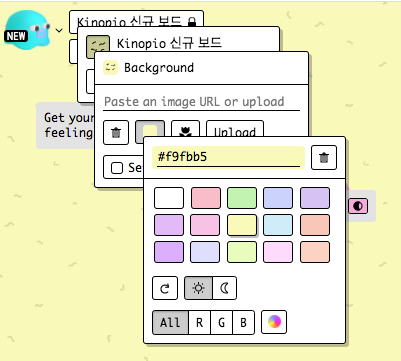 새로운 보드는 언제든지 생성이 가능합니다. 상단 Kinopio 아이콘 옆의 + 기호를 클릭하면, 새로운 Space를 만들지, 아니면 Templates에서 선택할지 메뉴가 표시됩니다. New Space를 클릭하면, 보드의 이름과 배경 색상을 변경할 수 있는 메뉴 버튼들이 표시되며 입력 가능합니다.