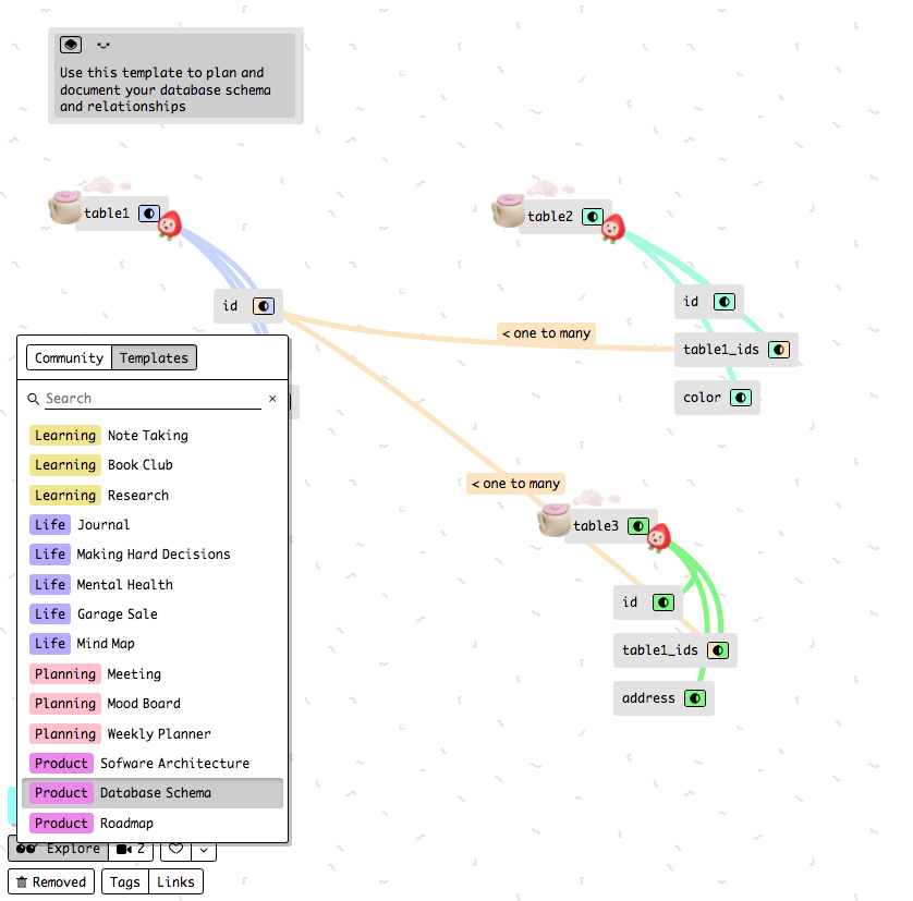 서비스 페이지에서 볼 수 있듯이, 딱딱한 협업 도구의 컴포넌트들 보다는 아기자기한 컴포넌트들의 UI/UX로 구성되어 있어 사용에 재미도 있습니다. 일과 업무에서 자료 리서치, 브레인스토밍, 무드 보드, 저널링(기록)등의 다양한 용도로 사용이 가능합니다. 기본적으로 회원가입(reigister)나 로그인 없이 사용이 가능해서 비대면 회의나 업무 등에서 화이트보드나 협업도구가 필요한 경우라면 빠르게 구동하여 사용이 가능합니다. ㅏKinopio에서는 다양한 template와 사용자들이 실제 작성한 다양한 예시들을 참고할 수 있습니다. 하단의 Explore메뉴를 클릭하면, “Community | Templates” 탭이 표시됩니다. Database 스키마를 kinopio를 사용해서 작성한 예는 오른쪽 그림과 같습니다. 다양한 사용자 작성 예시를 통해 활용방법들을 살펴보시면 도움이 되실 거 같네요.