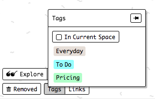 카드들을 분류하기 위해 tag 사용이 지원됩니다. 텍스트에서 [[ ]]내에 태그를 입력하면 해당 태그가 하이라이트 되어 표시되며, 화면 하단의 Tags 메뉴를 통해서 태그 필터링을 할 수 있으며 해당 카드만 확인이 가능합니다(In Current Space 앞의 체크박스에 체크하면 해당 태그의 카드만 필터링되어 표시).