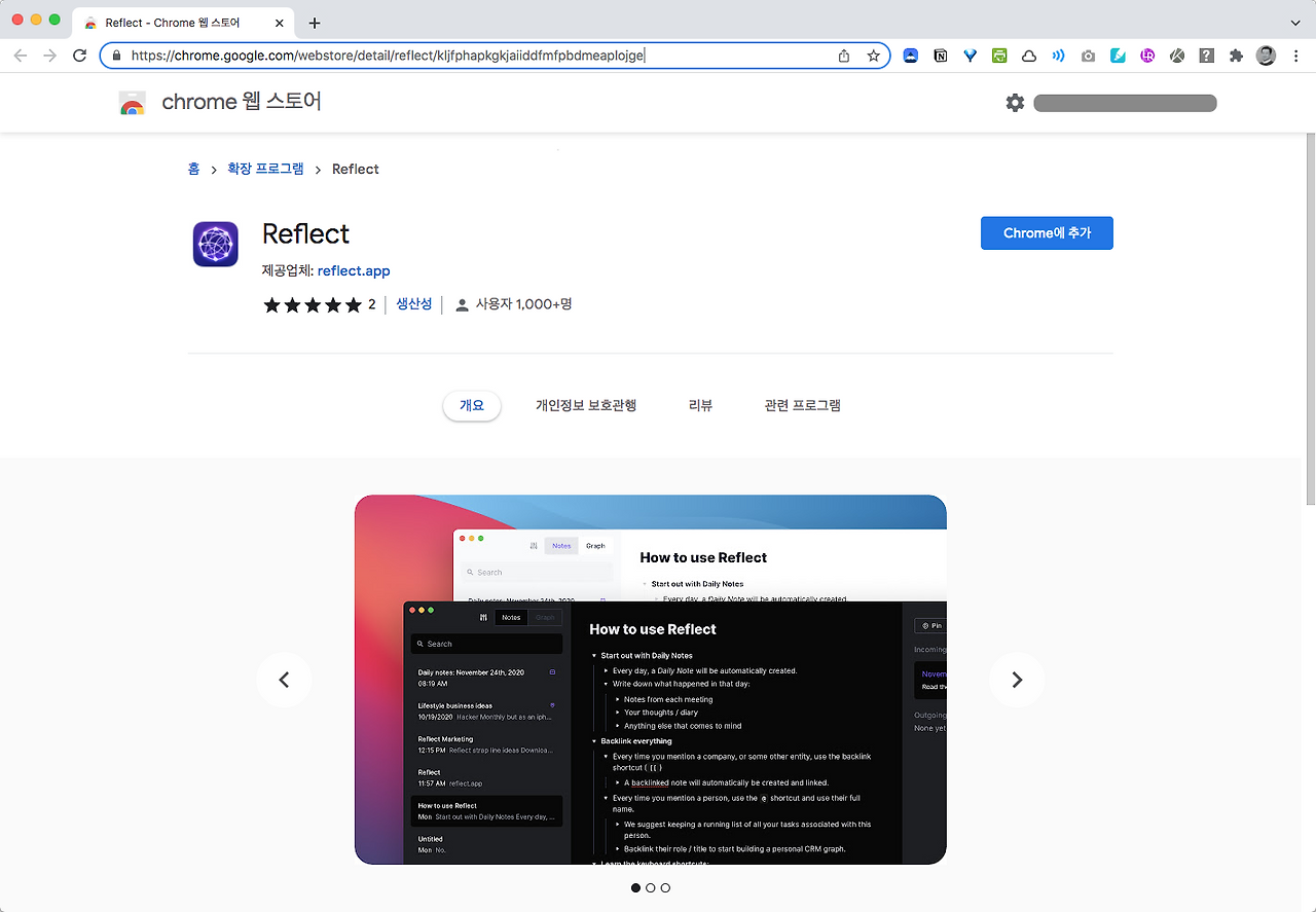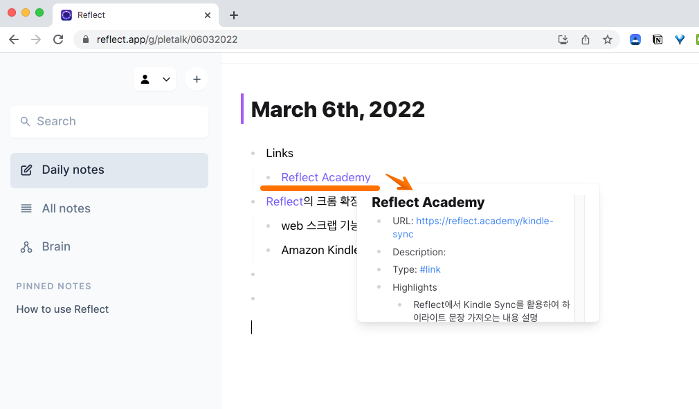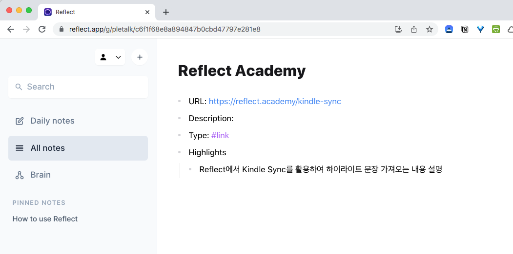 크롬 웹 브라우저 클리퍼 (Clipper) - 크롬 웹 브라우저의 확장 프로그램을 설치하면, 웹 사이트 링크를 편리하게 클리핑 하여 링크 형태로 Reflect에 추가가 가능합니다. 클리핑 할 페이지의 텍스트 영역을 선택하면, 해당 텍스트가 자동으로 스크랩 되어 노트에 링크로 입력됩니다. 클리핑 시 이미지는 노트에 추가되지는 않네요. 링크 추가 시, #link라는 tag가 자동으로 추가되어 나중에 필터링할 때 사용 가능합니다.