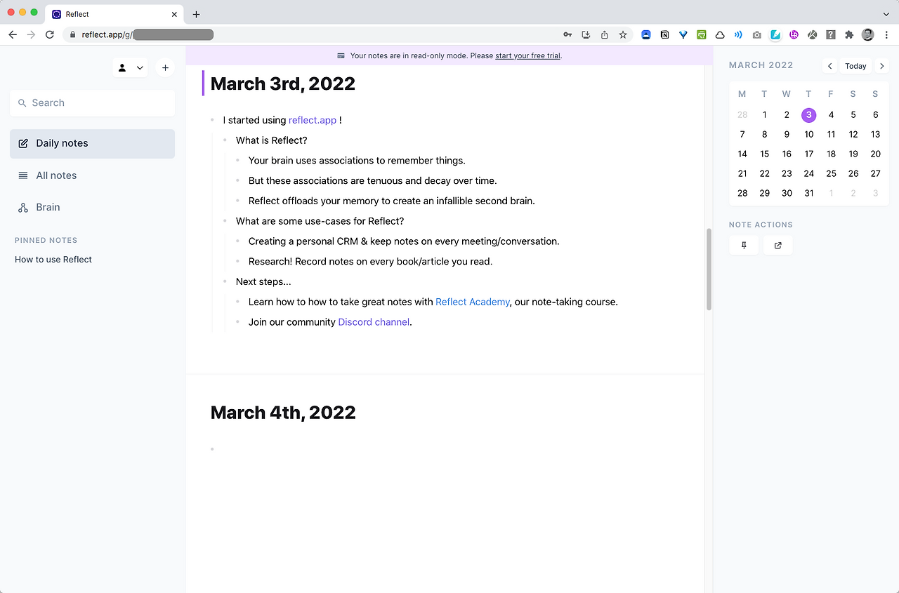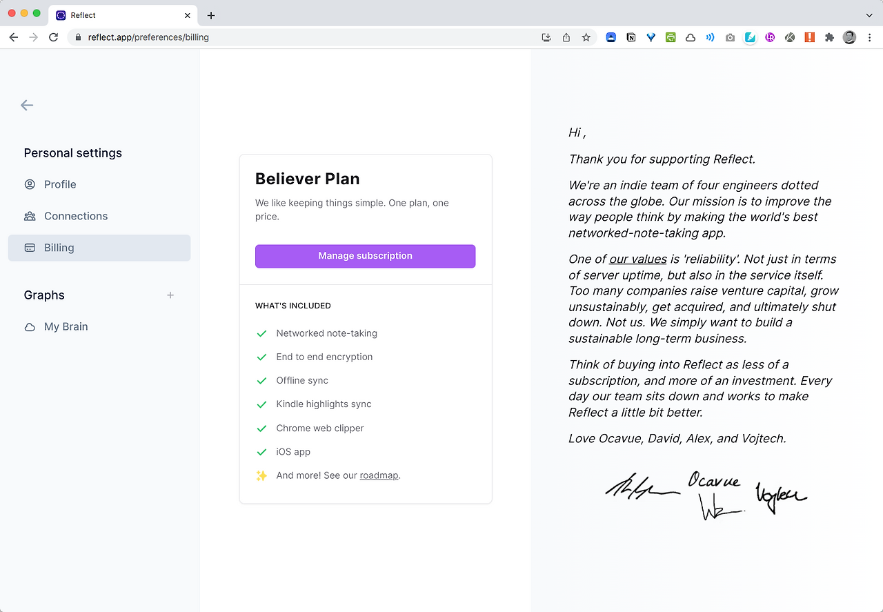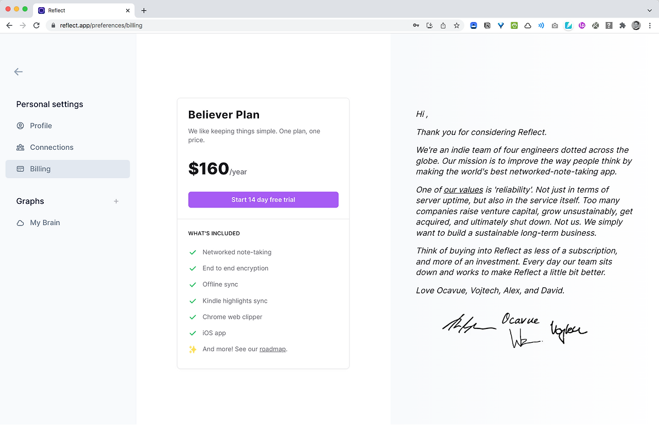 일반적으로 무료 서비스의 경우, 몇가지 제약 사항이 기능상에 존재하거나 일자 제한이 있는데요. Reflect의 경우, 기본적으로 Read-Only 모드로만 동작하여 편집이나 내용 추가를 위해서는 14일 무료 사용을 위해서라도 카드 등록이 필요합니다. 저도 Reflect에서 제공되는 기능들이 궁금하고, 다른 그래프 기반 노트 프로그램과의 차이도 알고 싶어서 일단 유료 등록을 했네요. 유료 가입 시, 년간 $160입니다. Roam Research가 년간 $150를 고려할 때 다소 비싼 감이 있네요. 유료 가입을 하면, Believer Plan 가입자가 됩니다.