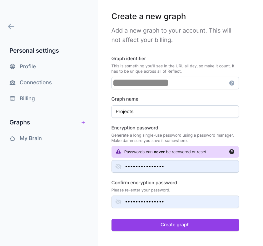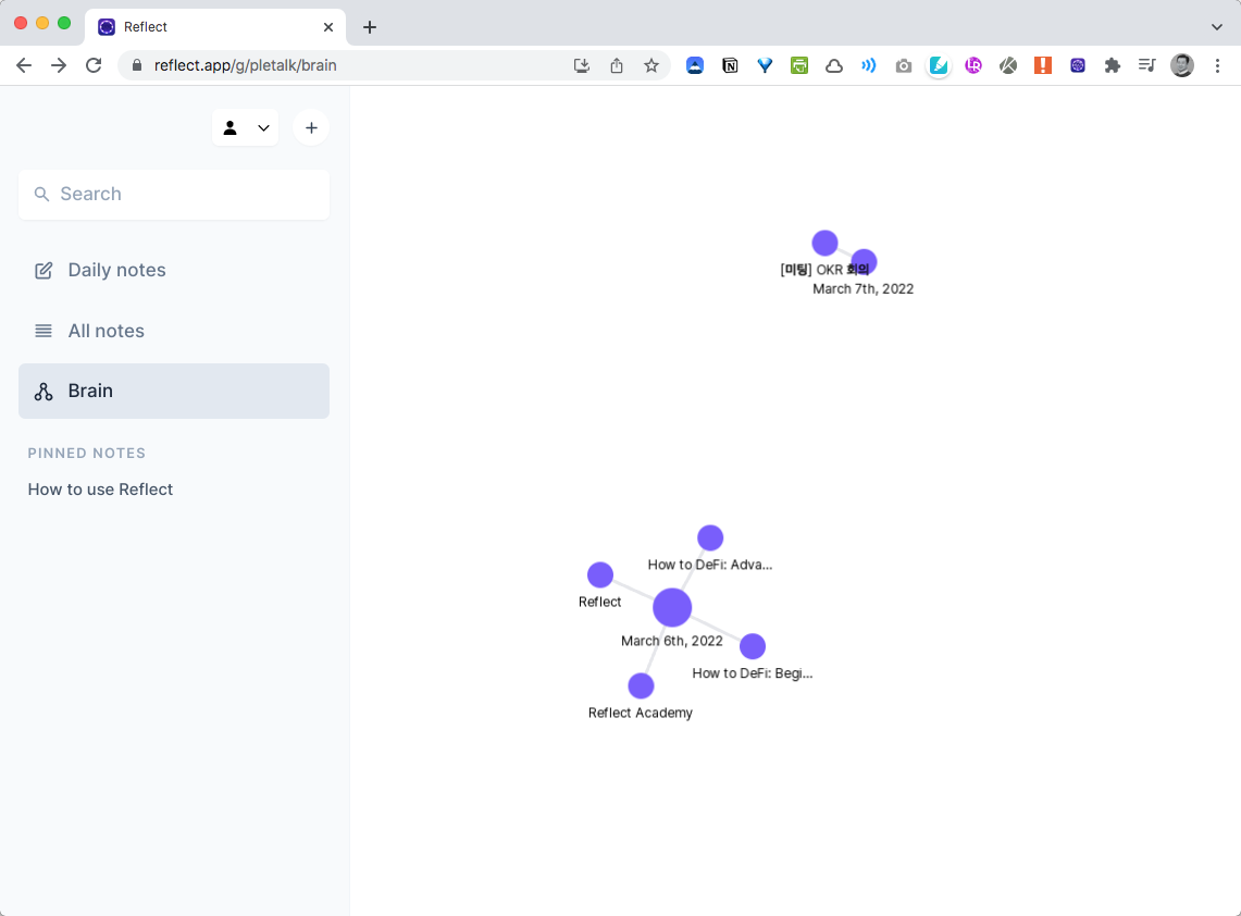 노트의 연결관계를 표시하는 시각화 도구인 그래프 기능도 Reflect에서는 제공되어 매우 유용합니다. Roam Research의 경우, cloud에서 지원되는 그래프는 최대 3개까지만 사용 가능하고 로컬(브라우저 내에서만 사용)의 경우 무제한인데요. 인터넷에 접속해서 언제 어디서나 사용할 수 있는 그래프 수의 제한이 아쉬웠는데, Reflect에서는 제한이 없는 것 같습니다(4개까지 새로이 생성해보 왔는데요. 계속 클라우드 기반 그래프 노트가 생성이 가능했습니다).