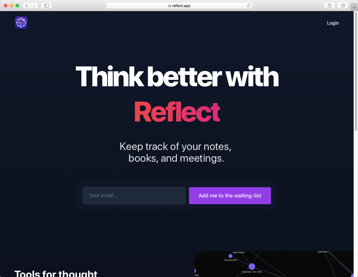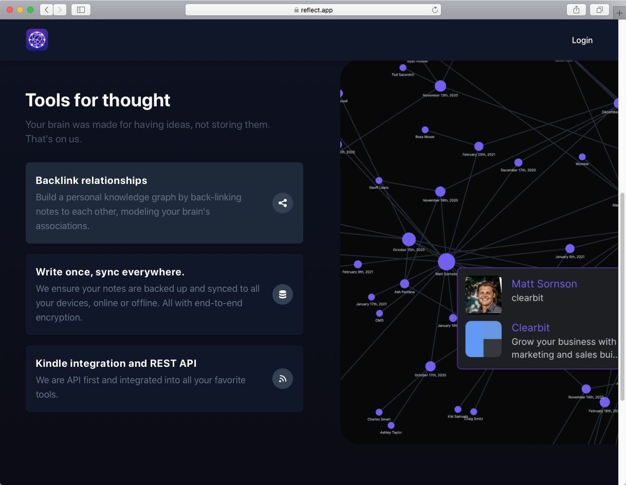 노트 애플리케이션으로 Roam Researh, Obsidian이나 Logseq와 같은 백링크 지원 및 노트 간 비주얼 그래프(Graph)를 지원하는 노트 프로그램들이 크게 주목받고 있는데요. 이번 글에서는 앞서 소개한 어플들과 유사한 기능들을 지원하지만 회의와 CRM, kindle Sync 등에서 좀 더 편리한 기능들을 제공하는 Reflect를 소개하고자 합니다. Reflect란 단어가 영어로 “회고” 또는 “되돌아보기”라는 의미를 생각해 볼 때, daily 기반으로 회의, 다이어리, 생각정리 등을 편리하게 작성하고 관리할 수 있을 것 같습니다.