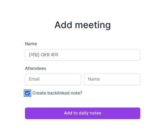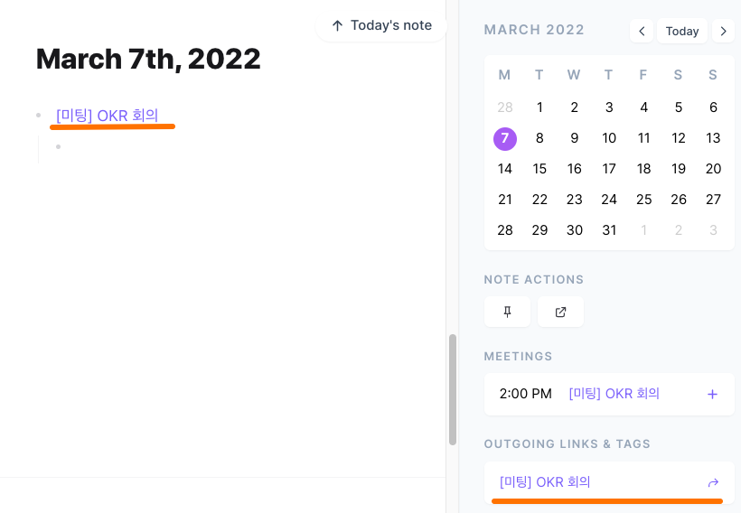 많은 그래프 노트 애플리케이션에서 미팅이나 회의, 모임 등의 일정에 대해 개별 노트를 만들어주는 기능은 편리하게 지원되지 않아서 Roam Research의 경우 캘린더 일정별로 주간단위로 다시 정리하여 일자별로 일정을 추가하고 있는데요. 이런 부분들을 Reflect에서는 Google 캘린더 연동으로 자동으로 제공해주어서 편리하네요. 일정을 클릭하면, Add Meeting 패널이 표시되면서 일정 관련 별도 페이지나 노트를 만들 수 있고 회의나 미팅 내용을 별도로 정리하고 저장할 수 있습니다.