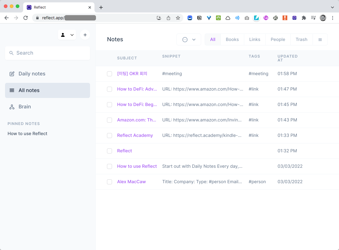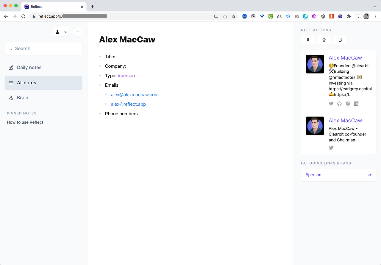작성한 노트를 필요에 따라 분류하기 위해 Reflect에서는 tag(#note)을 사용합니다. 아래는 CRM에서사람별로 기본 정보를 입력하고(예로, Alex MacCaw의 연락정보 예시 - Reflect의 CEO) #person이라는 태그를 노트에 입력해 놓으면, 아래 오른쪽 화면처럼 전체 노트(All notes)에서 해당 tag로 손쉽게 필터링해서 해당 tag의 노트들만 찾아볼 수 있습니다. 사용 가능한 기본 태그는 people, links, books이며 사용자 정의 필터는 맨 마지막 메뉴에서 선택 가능합니다.