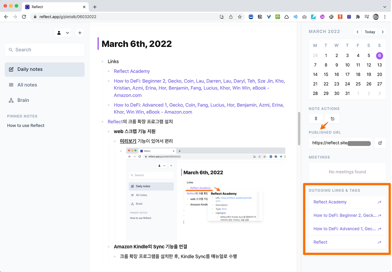 Reflect에서 일자별 노트를 중심으로 작성한 예시는 아래와 같습니다. 클리퍼에서 추가한 링크들은 Links 섹션에 추가되며, [[ ]]를 사용해서 새로운 주제 노트를 만들 수 있으며, 작성한 노트 자체를 Public 하게 공유도 가능합니다. 노트에 추가된 links들 중에서 outgoing links와 tags들은 빠른 사용을 위해 오른쪽 하단에 별도로 영역이 표시되어 페이지 내용의 스크롤 없이 빠른 이동이 가능한 점은 매우 유용할 것 같습니다.