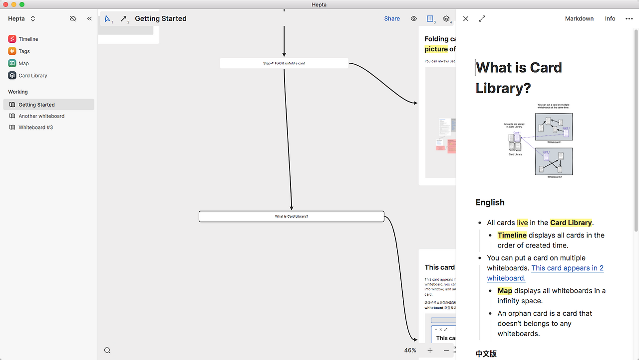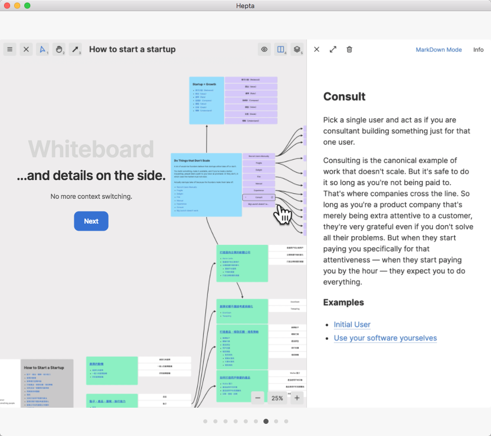 Heptabase의 가장 큰 장점은 Whiteboard 내에서 관련 자료나 정보, 데이터들을 나누어 Card로 저장하고, 이를 마인드맵처럼 연관관계를 편리하게 설정할 수 있다는 점입니다. Card의 내용을 전부 표시하지 않고 접어서 제목만 표시하고, 연결해두는 것도 가능합니다(아래 왼쪽 그림). 필요한 해당 Card의 내용을 split view(아래 오른쪽 그림)를 통해서 편리하게 확인할 수 있어 복잡한 연결관계의 문서 구조 속에서도 필요한 정보들을 빠르고 간편하게 확인 가능합니다. Card를 접고 펼쳐서 필요하거나 꼭 확인이 필요한 정보나 콘텐츠들을 선택적으로 보이게 하거나 숨길 수 있어서 자료 정리와 분류 등에 매우 유연하게 활용이 가능하네요. Whiteboard 전체의 뷰를 키보드와 마우스 휠로 줌인/줌 아웃할 수 있어 Witeboard 내에서 필요한 Card를 빠르게 찾고 포커스 할 수 있는 점도 편리한 것 같습니다.