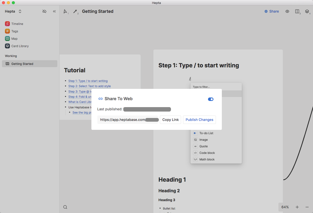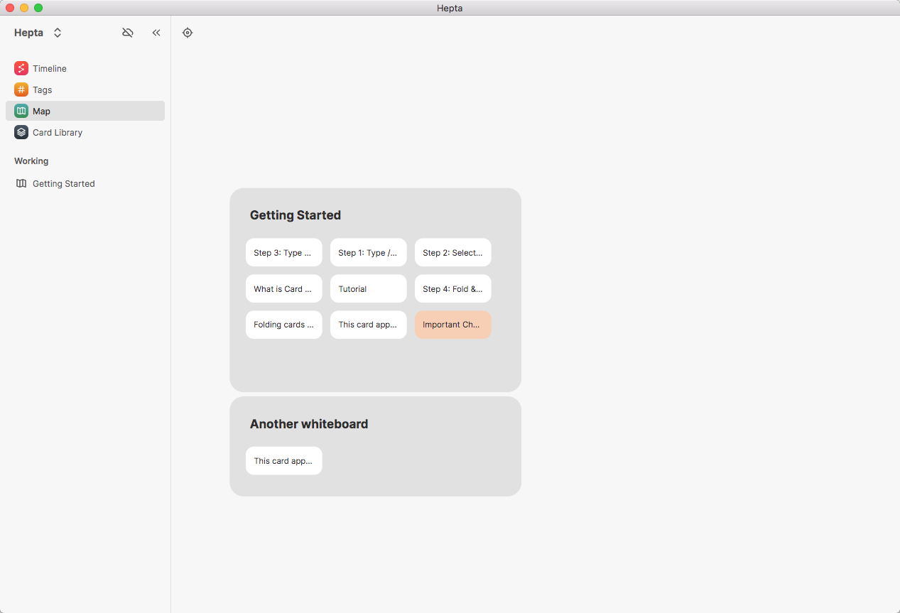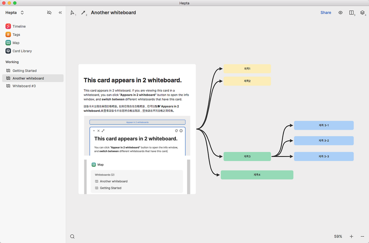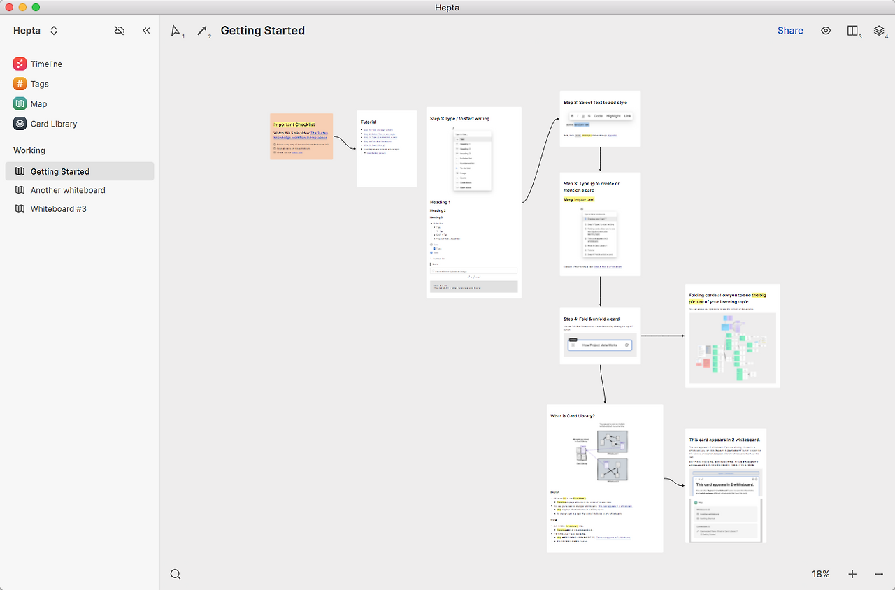 Heptabase는 4개의 상단 메뉴를 제공하고 있는데요. Timeline은 일자 기반의 노트(Card)를 작성하고 추가할 수 있으며, Tags는 Card를 분류하기 위한 사용자 정의 tag순서로 Card를 보여줍니다. Map은 whiteboard들의 전체 배치를 볼 수 있으며, Card Library는 개별 Card(노트)들을 보여줍니다. Whiteboard의 이름이 표시되어 바로 Whiteboard로 이동 가능합니다. Whiteboard는 필요에 따라 공개적으로 공유하는 기능이 제공됩니다.