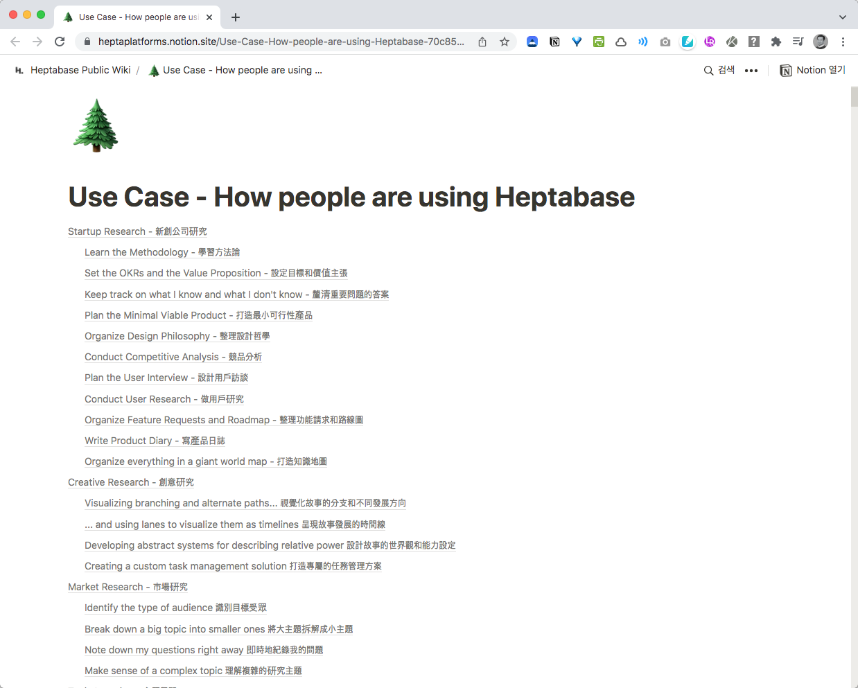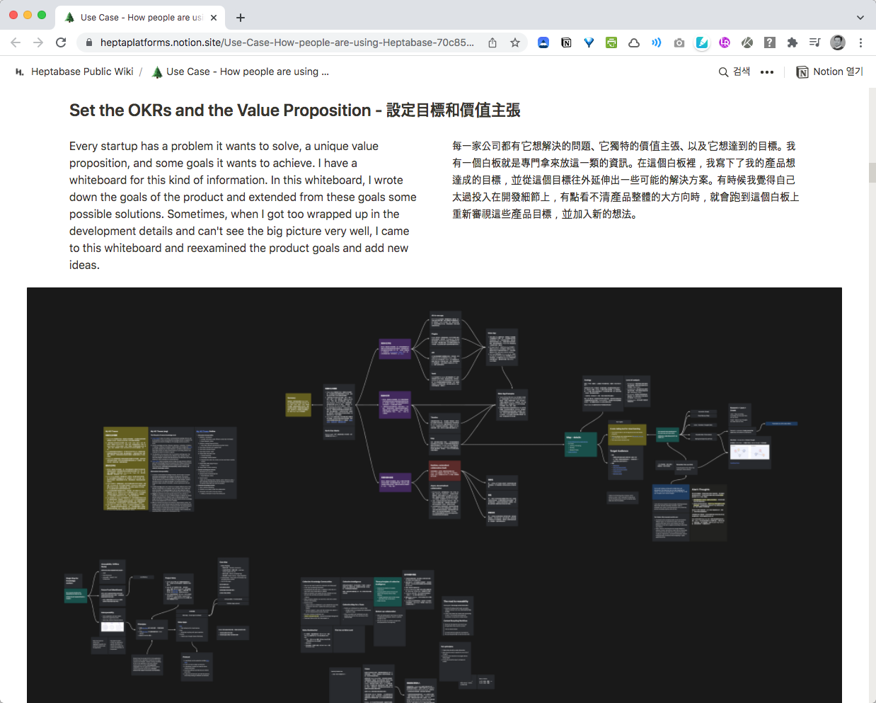새로운 노트 도구나 서비스의 경우, 다양한 사용 케이스들이 궁금한데요. Heptabase에서는 아래와 같이 다양한 Use Case를 정리하여 공개하고 있습니다. OKR, 스타트업에게 도움이 되는 다양한 시장과 고객 조사 방법들, 주제별 공부 내용 정리등의 예시를 확인해볼 수 있습니다. 복잡한 내용들을 작은 주제들로 나누어 정리하고 연결하는 모습들을 보니, 확실히 자료 리서치나 프로젝트와 같은 관리업무등에 유용할 것 같습니다.