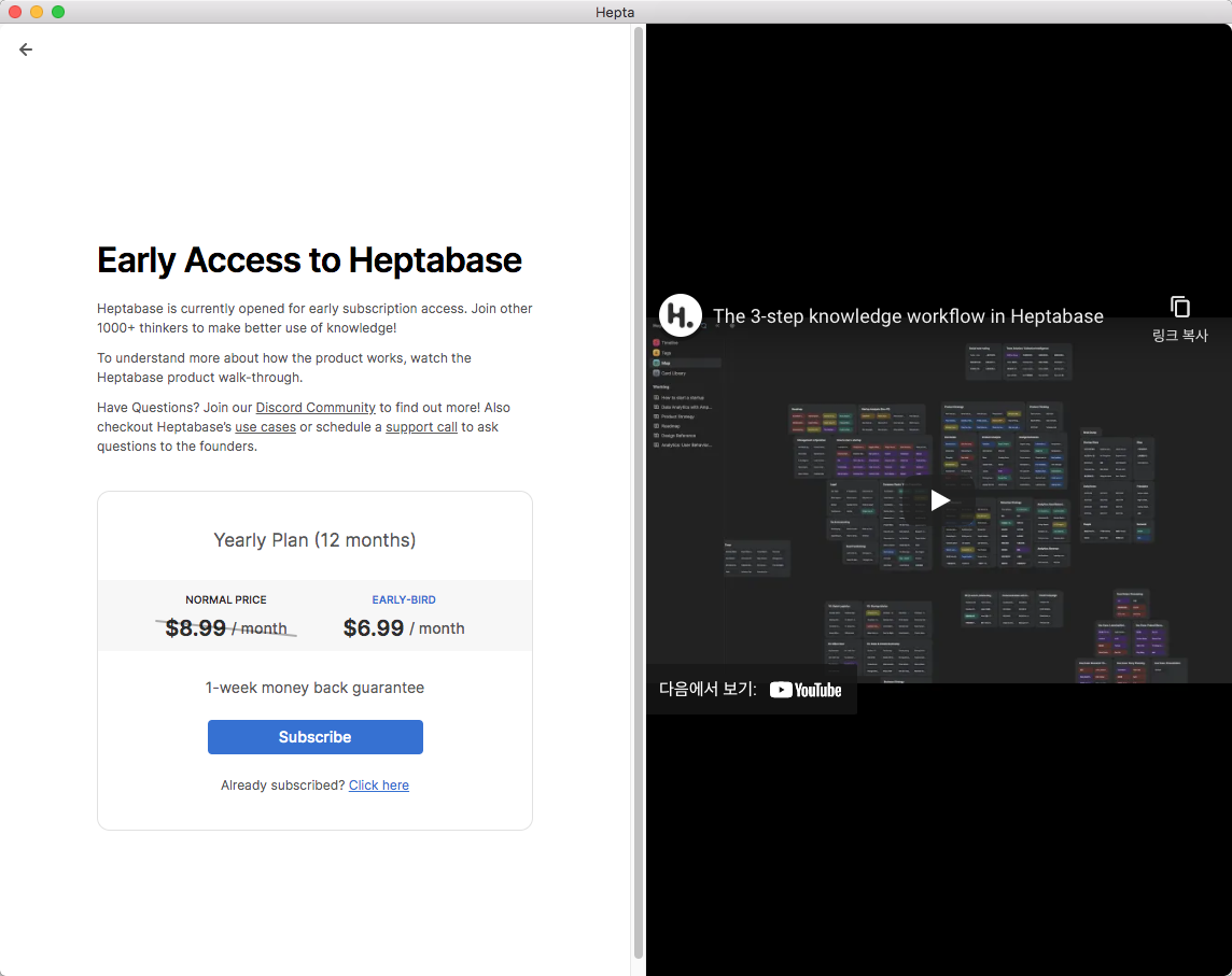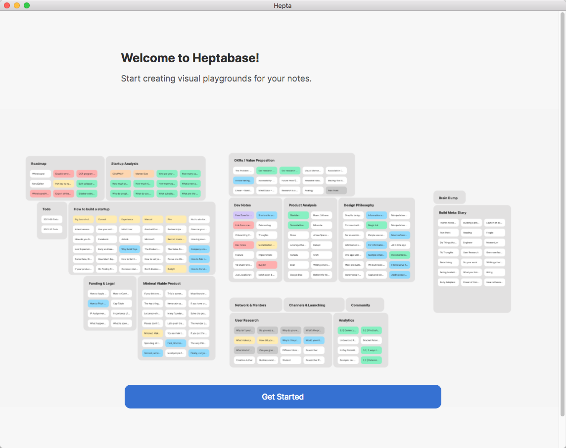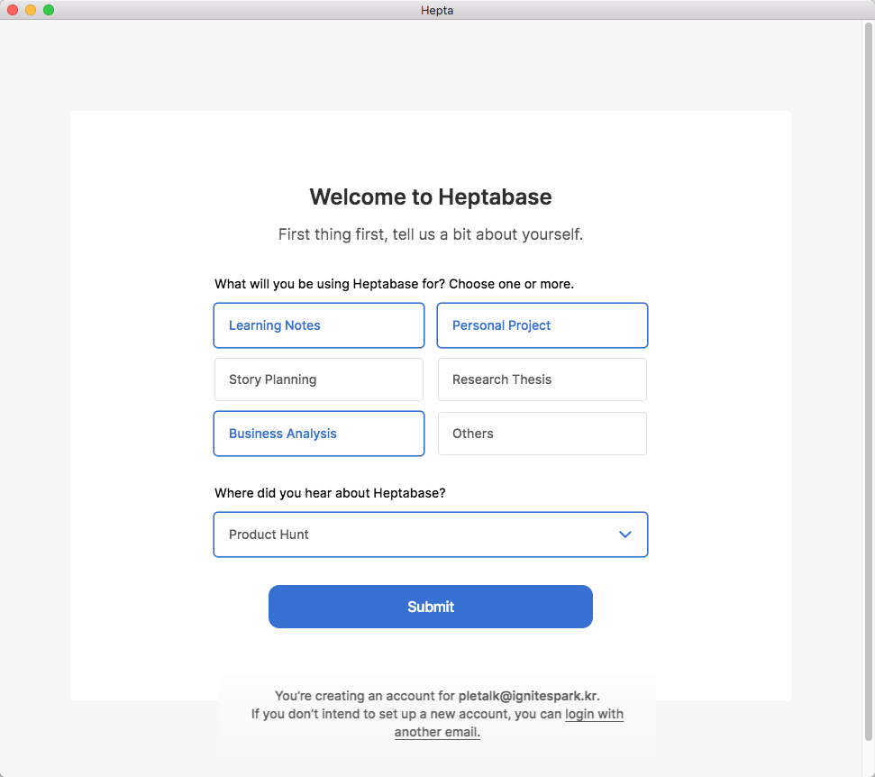 Heptabase는 웹 환경을 제공하지 않기 때문에, 먼저 자신의 운영체제에 알맞은 설치형 프로그램을 다운로드하여서 설치합니다. Mac 버전의 경우 M1버전도 별도로 제공하고 있습니다. 설치를 완료하면, 아래와 같은 화면이 표시됩니다(저는 x86의 Mac 버전을 설치했습니다). Reflect와 마찬가지로, 무료 사용을 위해서는 카드 등록이 필요하네요. 유료 사용 시, 비용은 월 $6.99(early access기준)입니다. 가입 후, 어떤 용도로 사용할지에 대한 질문에 저는 학습노트, 프로젝트 관리, 그리고 비즈니스 분석의 용도로 사용할 수 있을 것 같아서 해당 항목을 선택했습니다. 이 선택으로 노트가 커스텀 되는 것은 아니네요.