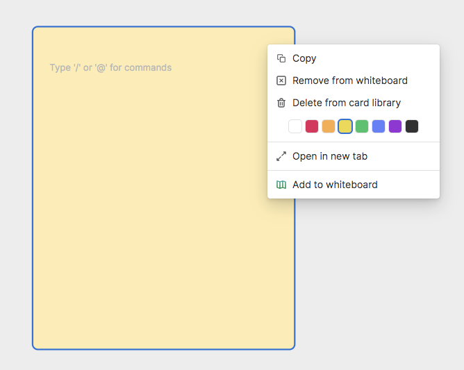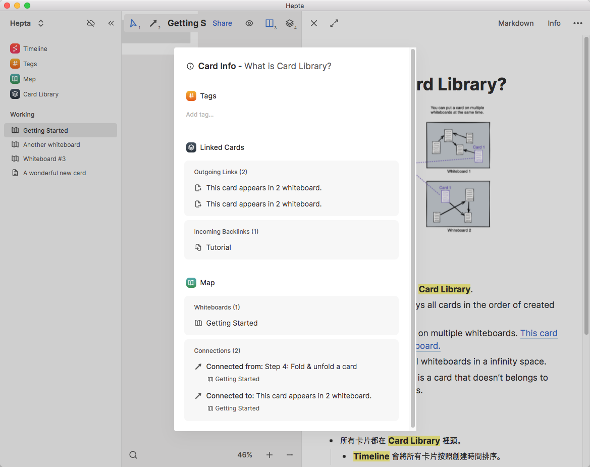 Card는 전체 색상 변경이 가능하며, Card와 관련한 정보는 Info를 통해서 확인 가능합니다. Card에 연결된 tags, Whiteboard, 연결된 또 다른 Card들의 정보를 목록으로 확인 가능하며 필요시, 해당 Whiteboard나 연관 Card로 바로 이동할 수 있습니다.