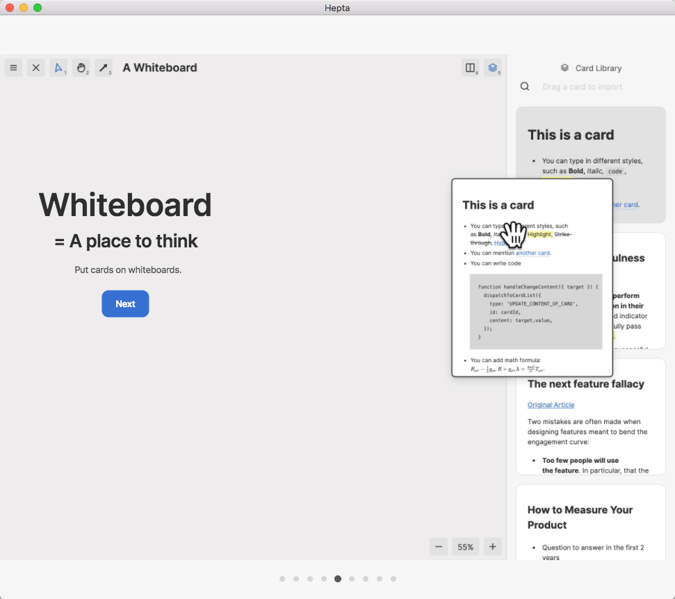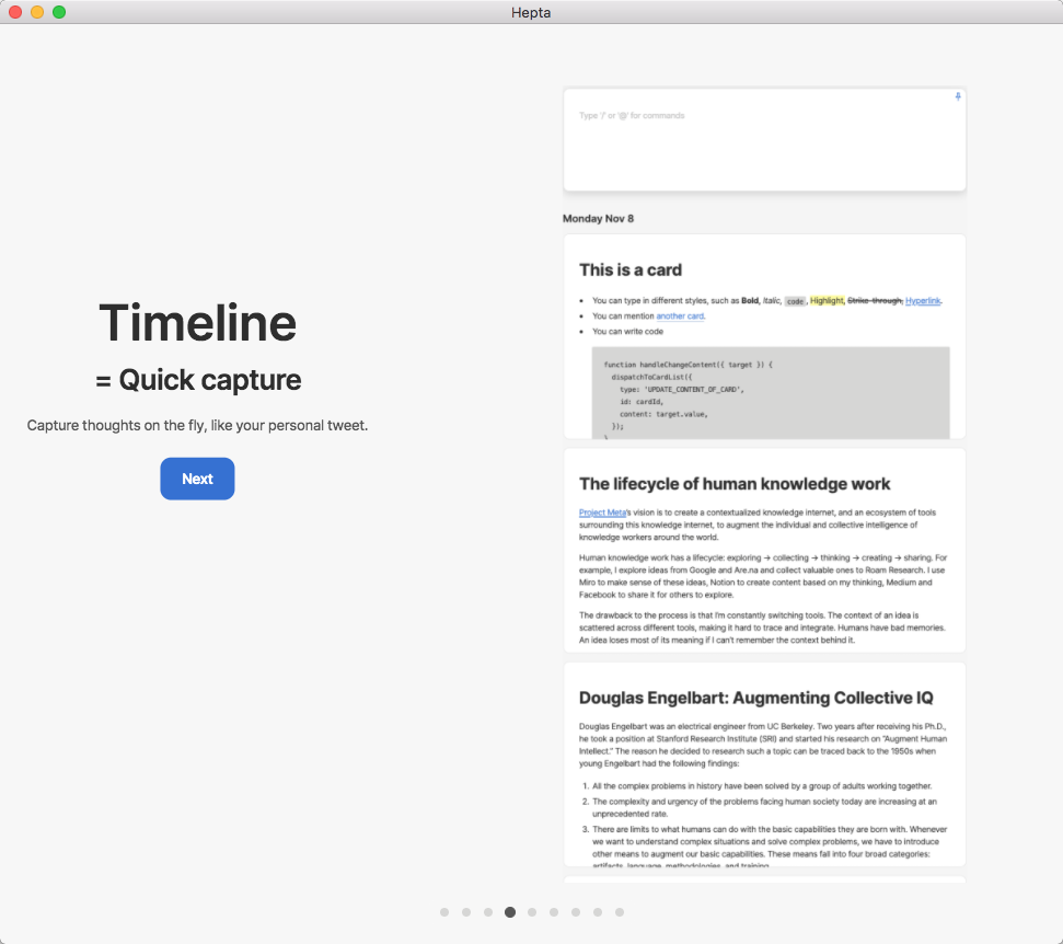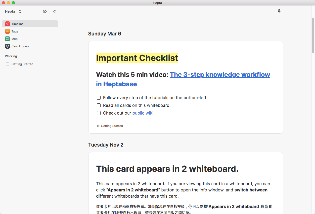가입이 마무리되면, Heptabase의 주요 구성 요소들과 노트 작성에 필요한 내용들을 중심으로 설명하는 화면이 표시됩니다. 기본적으로 Whiteboard라는 공간 안에 Card라는 노트 작성을 위한 영역이 위치합니다. Timeline은 일간 기준으로 작성할 노트 내용들을 Card 형태로 빠르게 입력하고 날짜별로 자동 저장됩니다. Map은 Whiteboard들의 전체 배치와 내용을 파악할 수 있는 영역이며, Whiteboard 내에서 Card의 내용을 전체 구조와 함께 볼 수 있는 Split Windows 제공은 매우 유용하네요(Roam Research에서도 노트를 shit-click으로 split 화면으로 표시하여 보여주는데요. 이 기능에 익숙하다 보니, Heptabase의 Split Window 기능이 매우 유용해 보입니다).