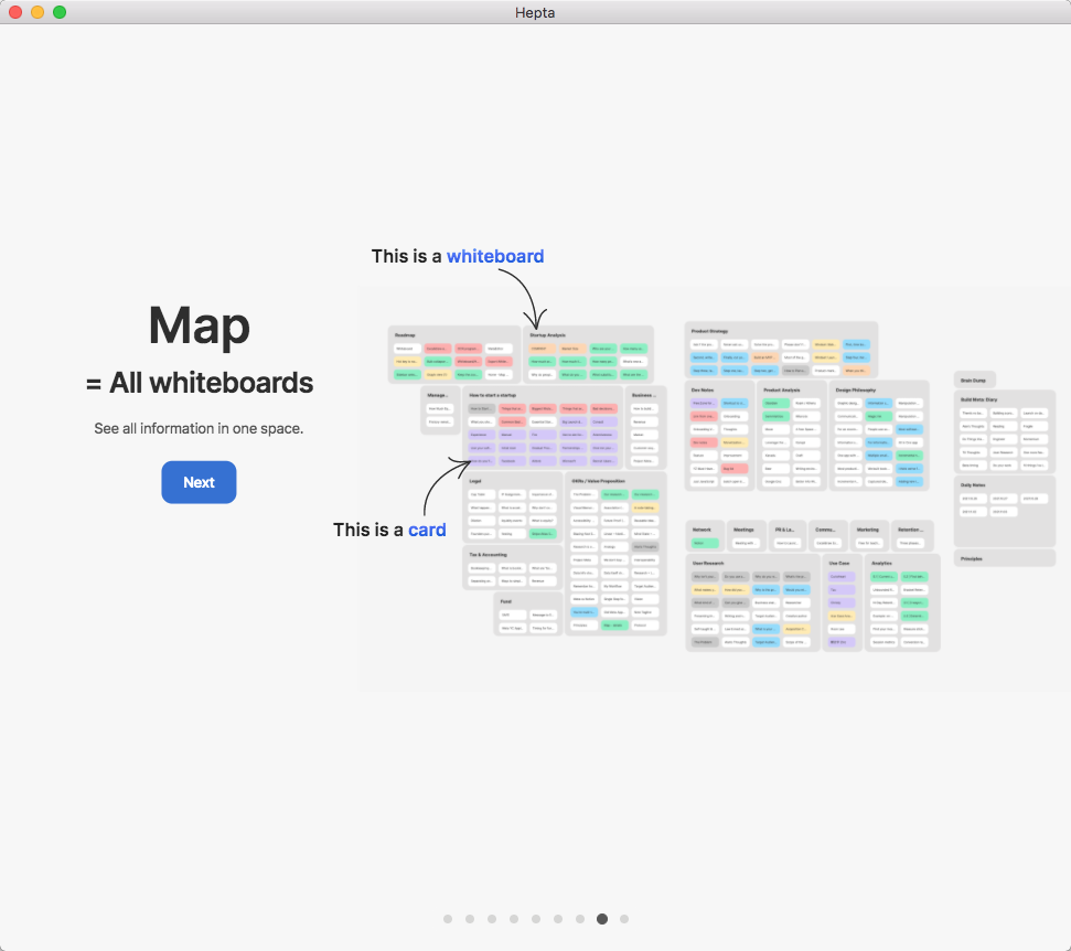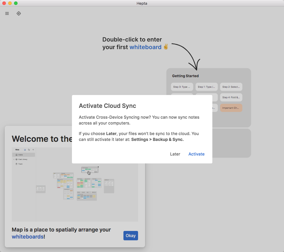 사용법에 대한 안내를 마치면, Cloud Sync를 할지 물어보는 창이 표시됩니다. 여러 디바이스(PC, 노트북등))에서 Heptabase를 사용한다면, 이 기능을 Active 시켜야 합니다. 활성화 후, 바로 whiteboard의 전체 모습을 보여주는 Map 화면이 표시됩니다. Map에서는 관련 있는 Whiteboard들을 물리적으로 함께 배치하여 표시해 줍니다.