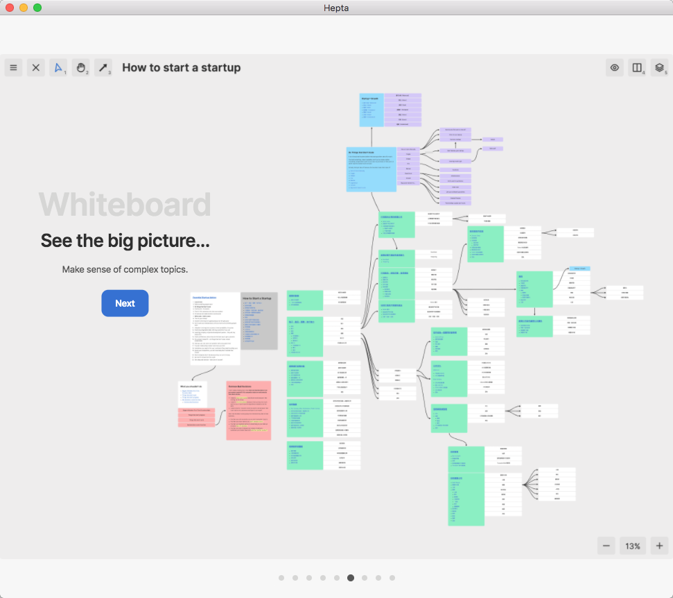 요약하면, Heptabase는 주제 기반으로 필요한 자료나 정보, 사진 등을 분절하여 연결하고 관리할 수 있도록 시각화하여 제공하는 점에서 체계적인 조사나 정보 수집, 분류 등에 적합한 노트 작성 도구로서 유용합니다. 특히, 정보나 자료 간의 연관관계들을 전체적인 시각에서 빠르게 확인하고 추가되거나 보완될 부분들을 식별할 수 있어서 복잡한 리서치 업무를 수행해야하거나 여러 논문들을 읽고 정리하기, 프로젝트의 다양한 수행 내역 관리등 좀더 체계적이고 상호 연결된 부분들을 빠르게 파악하면서 기록과 노트등을 작성해야하는 업무나 일을 하신다면 한번 사용해보시면 도움이 되실 것 같네요.