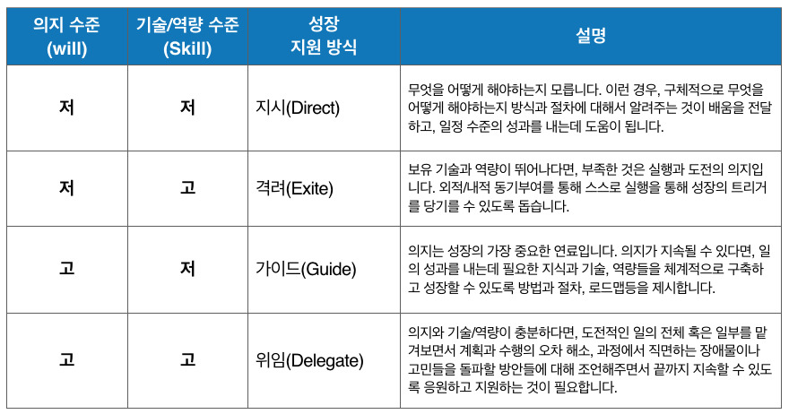 각 축의 의미에 대해 좀 더 살펴보겠습니다. 의지가 높거나 낮다는 것을 일에 대한 태도나 자세 등을 통해 일반적으로 감지할 수 있기는 하지만, 표면적으로 내보이는 모습 이면에 대해 생각해볼 필요가 있습니다. 실제 의지가 새로운 일이나 기대로 인해 일시적으로 높은지, 지속되는지 대해 좀 더 알아보는 것이 좋습니다. 여기에 추가해서 의지 수준이 생각보다 낮다면 그 원인들을 알아볼 필요가 있습니다. 면담이나 상담을 통해 대상 팀원이 맡은 일이나 업무에 대한 막연한 두려움으로 관심은 있지만 일의 수행에 의지를 보이지 못하는 것인지, 아니면 일이 어렵고 힘들어서 진짜 의지가 없는지 구분이 필요합니다. 대상자의 의지(will)가 실제로 “Will/Skill 매트릭스”내 4분면의 선택에 매우 중요하다는 점에서 면밀한 파악이 이루어지면 좋을 것 같네요. 또 다른 축인 “기술/역량”은 대상 직원이나 팀원이 보유하고 있는 지식, 경험, 학습 수준, 보유/적용 가능한 기술들, 문제 해결 역량 등으로 업무나 일에서 상사나 관리자라면 그리 어렵지 않게 파악이 가능할 것으로 생각됩니다. 2x2 매트릭스를 구성하는 각각의 영역들의 내용과 특징들을 살펴보면 다음과 같습니다. 대상 직원과 팀원이 처한 상황에 다르다는 점에서 상황에 알맞은 성장 방안을 찾고 모색한 후 적용하는 것이 바람직합니다.