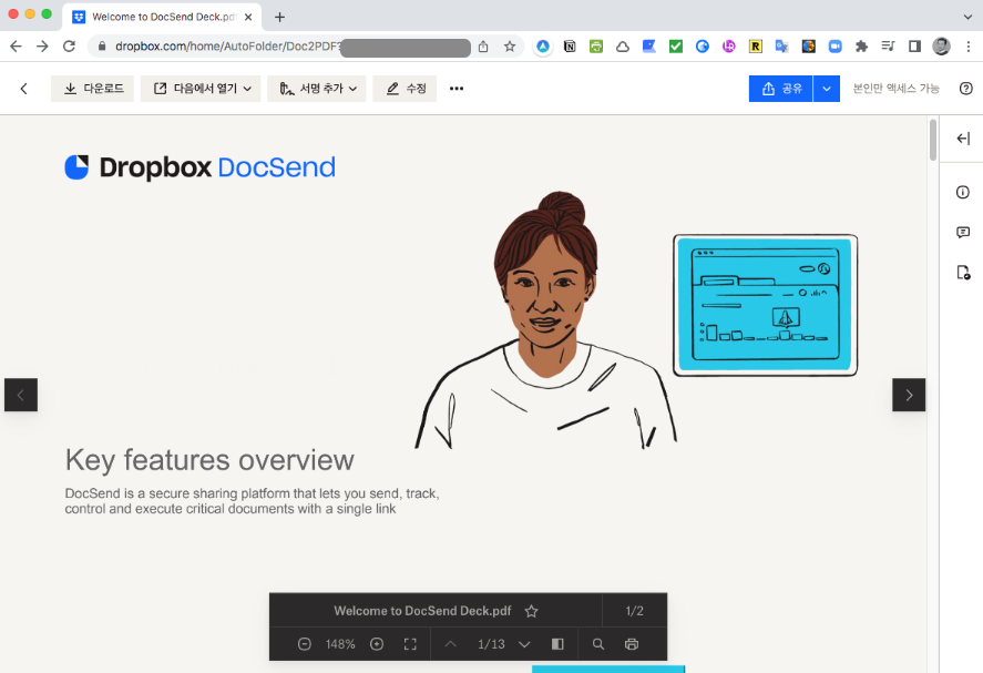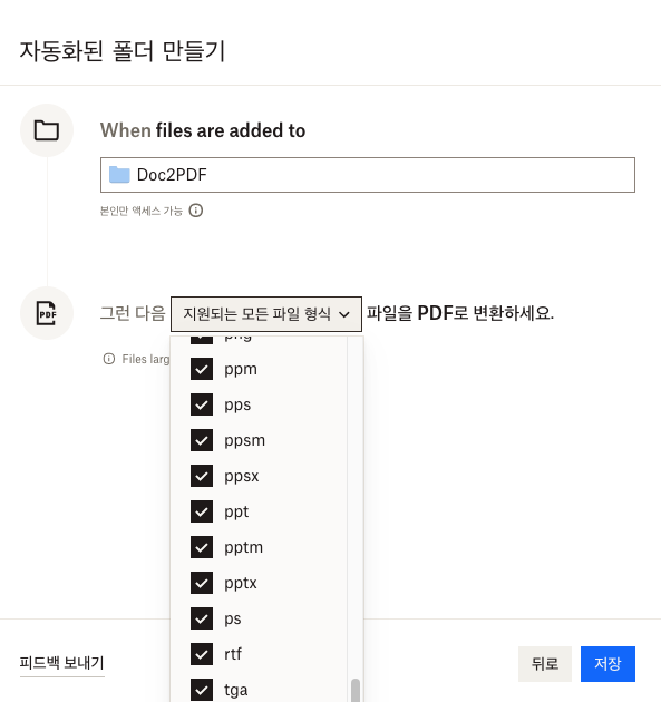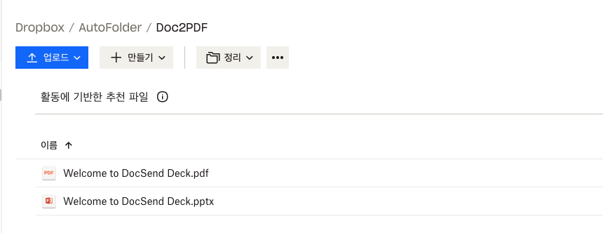 또 다른 예시로, ppt파일을 폴더에 저장하면 자동으로 PDF로 변환하는 자동화 폴더 설정에 대해 알아보겠습니다. 자동화 폴더를 생성하고, 해당 폴더에 저장될 파일의 유형을 설정합니다(다양한 포맷들을 지원하고 있어서 필요한 문서 파일 포맷만 선택 가능합니다). Dropbox의 DocSend에 대한 소개 자료(pptx 포맷)를 Doc2 PDF 자동화 폴더에 업로드하니, 동일 파일명의 pdf가 자동으로 생성되었네요.