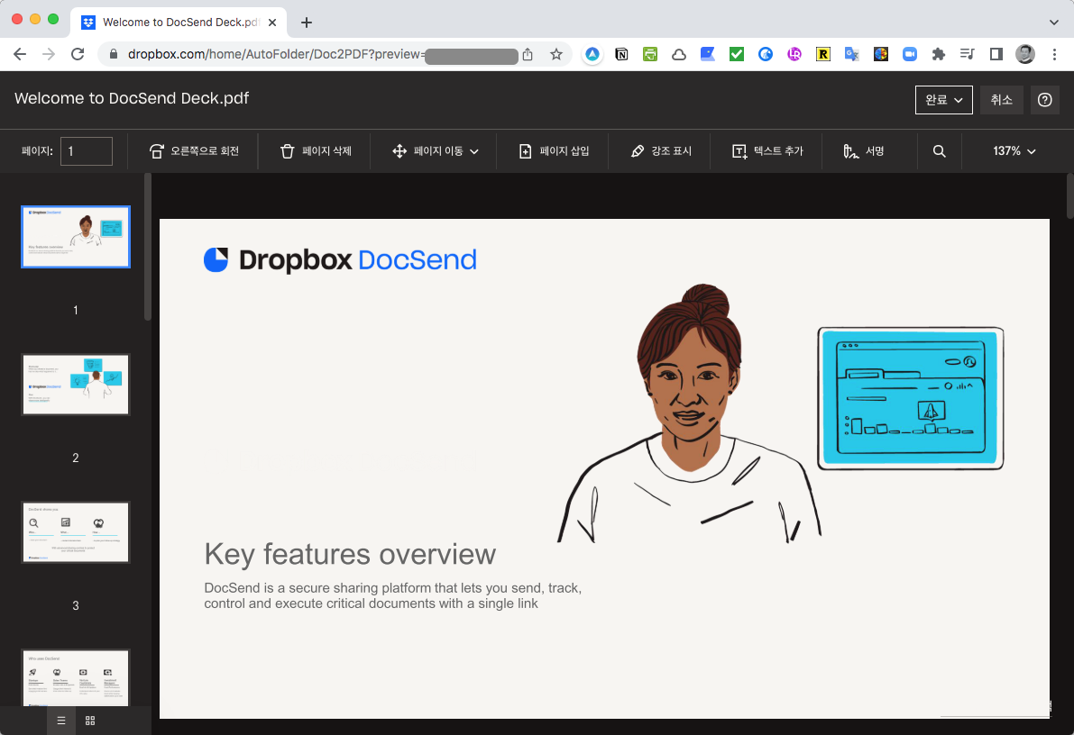 Dropbox에서 기본으로 제공되는 PDF 뷰어를 통해 PDF파일의 내용을 바로 확인할 수 있습니다. PDF 파일에 대한 간단한 수정이나 변경도 Dropbox의 PDF “수정” 기능을 통해 가능합니다. 상단의 “수정”을 클릭하면, 아래와 같이 PDF 편집 화면이 표시되며, 페이지 회전, 이동, 하이라이트, 텍스트 추가, PDF 병합등의 작업도 가능합니다.