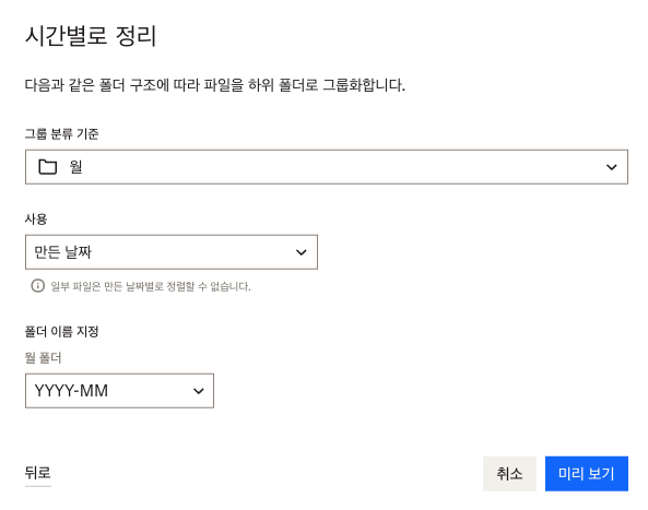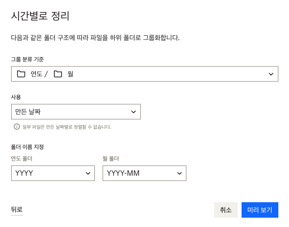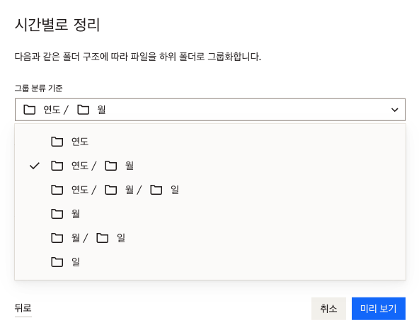 저는 저장 파일의 연도별, 년도내 월별 분류 저장을 하고 싶어서 “다중 파일 정리” 메뉴항목 중에서 “기간”을 선택하여 그룹 분류기준을 변경해 보기로 했습니다. 아래의 그림과 같이 그룹 분류 기준을 다양한 형식으로 하위폴더 생성이 가능해서 좋네요. 설정 항목들을 확정하면, “규칙 미리 보기”기능이 있어 어떻게 폴더들이 계층화되는지 미리 확인해 볼 수 있습니다.