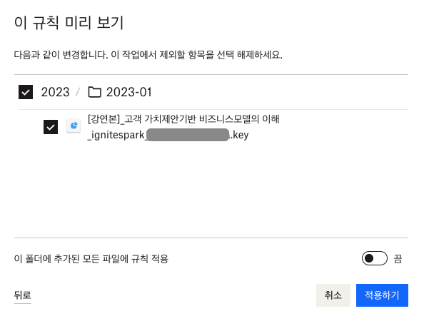 파일의 이름 변경 규칙 설정 > 폴더에 추가되는 파일명에 지정된 키워드나 단어를 추가하여 파일명 변경