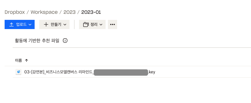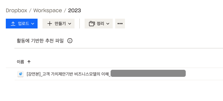 새로운 폴더인 "Workspace"가 생기고 자동화 폴더가 생성되었습니다. 이제 이 폴더에 파일을 저장하면 자동적으로 연도별 저장이 됩니다. 설정된 자동화 폴더의 옵션을 변경하고 싶다면, 상단의 “정리”메뉴를 선택하고 “자동화 수정”을 클릭하면 위의 분류 옵션 화면(월, 년 선택)이 표시됩니다. Workspace에 파일을 새로이 추가하니, 2023이라는 새로운 폴더가 생성되었고, 해당 파일이 저장되었습니다.