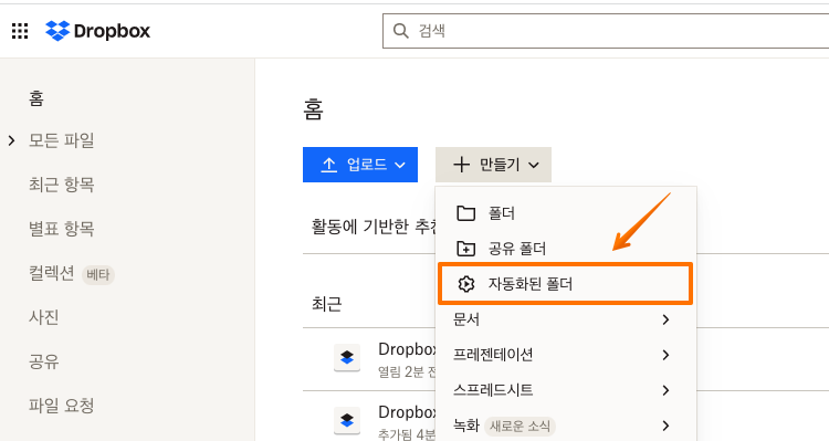 개인적으로 문서나 자료등의 보관과 백업을 위해서 Dropbox를 오래전부터 사용하고 있습니다. 초창기 클라우드 스토리지 서비스로 시작했지만, 현재는 개인과 기업의 자료관리 통합 기능과 제품들을 다수 지원하는 플랫폼 서비스 - 문서의 자료나 공유(Transfer), 서명 날인 문서 보관/관리(Sign, DocSend), 패스워드 관리(Password), 영상 및 오디오 녹화 및 저장 관리(Capture), PC나 노트북 설치형 자료나 문서 통합 검색 프로그램인 Command E 등 - 로 변신하고 있습니다. 이러한 변화 속에서 클라우드 스토리지 서비스의 기능들도 계속 추가되고 진화 중에 있는데요. 이 가운데에서 Dropbox 사용자로서 매우 기대되는 기능인 폴더 “자동화” 기능에 대해 이번 글을 통해 소개합니다.