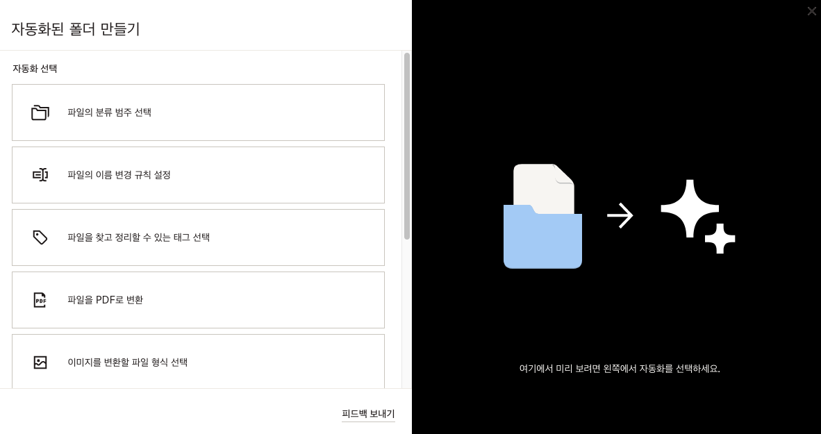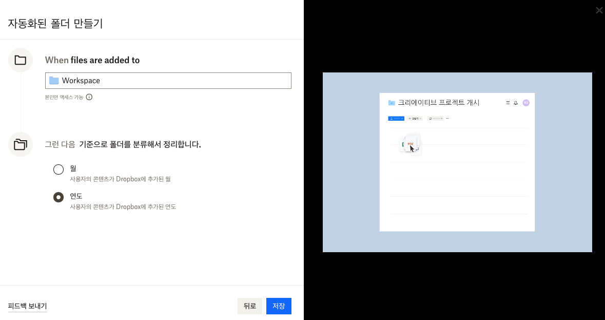 실제로 Dropbox가 제공하는 자동화 기능을 사용해 보겠습니다. 저는 Dropbox에 저장되는 파일을 년도별로 분류하고자 “파일의 분류 범주 선택”을 먼저 선택했습니다.