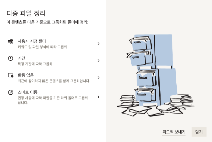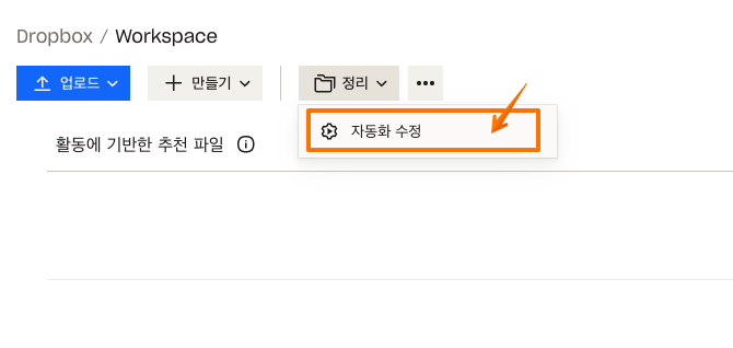 그런데, 위의 방식에는 활용상의 제약이 있습니다. 일단 Workspace 내에 파일이 저장되는 경우 자동화 규칙에 따라 연도별로 분류되어 저장이 됩니다. 만일, 년도에 따라 자동으로 월별로 하위 폴더를 생성하고 문서나 파일의 분류를 세분화하고 싶다면 한계가 있습니다. 다행히도 Dropbox에는 이러한 계층적 구조형태의 자동화 폴더 설정과 활용 기능이 지원됩니다. Dropbox의 “다중 파일 정리” 메뉴를 통해 사용자 지정 필터, 기간별로 그룹화, 사용하지 않은 콘텐츠를 자동으로 분류하는 기능들을 추가적으로 적용할 수 있습니다.