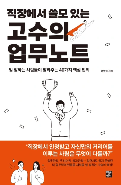 업무를 잘하는 사람들은 그들만의 노하우가 있습니다. 옆에서 보면 별다른 것이 없어 보이지만, 일의 성과와 속도는 다르게 나타나는데요. 정병익 님의 “직장에서 쓸모 있는 고수의 업무노트”에서 업무 고수들의 숨겨진 비결의 몇 가지를 알 수 있었습니다. 이 책은 일과 업무를 더 잘하고자 하는 직장인들에게 도움이 될 40가지의 내용을 법칙으로 정리하고 있는데요. ‘법칙’이라기보다는 ‘업무 스킬’이나 보유하면 도움이 될 ‘역량’에 대한 내용으로 이해하시면 좋을 것 같네요.