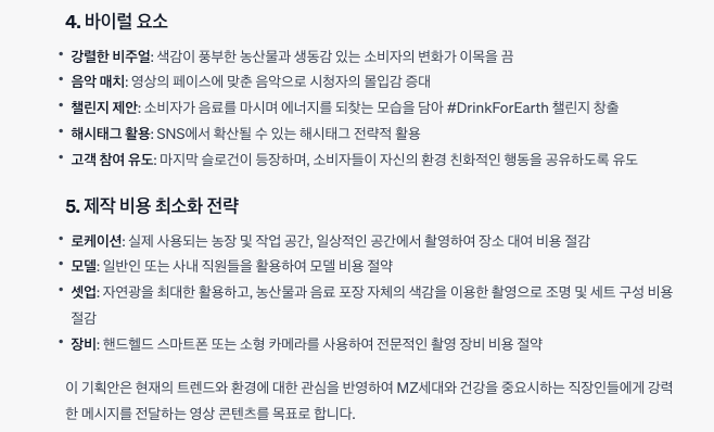 프롬프트가 작성되었다면, ChatGPT에 위의 내용을 그대로 입력하면 아래와 같은 기획서의 주요 내용을 답변으로 얻을 수 있습니다(ChatGPT 4.0 기준). “지구를 위한 한 모금”이라는 제목을 시작으로, 영상 콘셉트, 스타일/분위기, 내용구성(초단위), 바이얼 요소와 무엇보다 적은 비용으로 제작할 수 있는 방법까지 알려 줍니다.