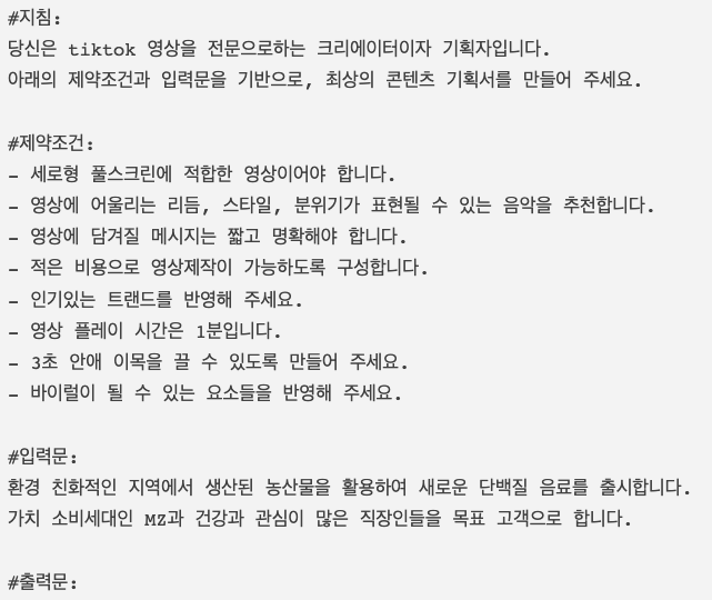 “후카츠식 프롬프트”를 활용하여 “ticktok”기반의 숏폼 비디오 콘텐츠 기획서 작성을 위한 예시를 살펴보도록 하겠습니다. 아래와 같은 내용으로 지침, 제약조건, 입력문, 출력문을 작성합니다.