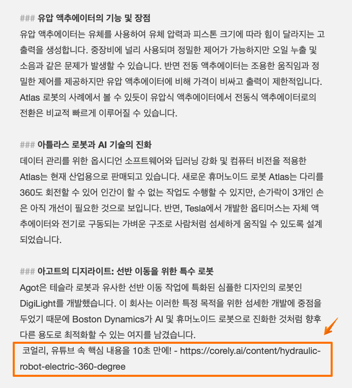요약된 내용들을 다른 문서에 인용하거나 활용하기 위해서는 복사가 필요한데요. Corely에서는 페이지 하단에 복사기능이 있습니다. 복사버튼을 클릭하면, 단순 텍스트 형태가 아닌 Markdown 포맷으로 복사가 가능합니다. 복사한 내용의 하단에 원문의 링크가 포함되어 있어서 원문을 확인할 수 있어서 도움이 되네요. 다만, Markdown 포맷이 원문 페이지의 형식을 그대로 담고 있지 못해서 아쉬웠습니다. 소제목 아래의 요약글에서 목록(bullet)이 제대로 표시되지 않은 부분들이 있었네요. 이 부분이 이후 서비스 업그레이드에서 개선되기를 기대해 봅니다.