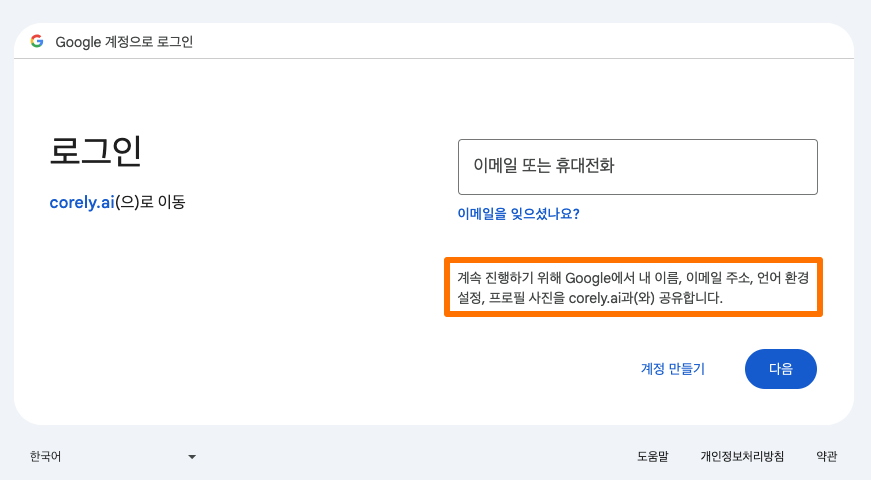Corely를 사용하기 위해서는 구글 계정의 로그인이 반드시 필요합니다. 상단의 “유튜브 URL을 입력해 주세요”의 입력 칸에 URL을 입력하면 무료 요약을 바로 볼 수는 없네요. 구글 계정 이외는 다른 계정이나 e-mail 가입이 지원되지 않아서 사용의 편의성 측면에서는 아쉬운 점도 있네요. 구글 계정 연동 시, 이름, 이메일 주소, 사진, 환경 등을 가져와서 사용한다고 합니다. 가입하시면, 프로필 사진으로 구글 사진이 표시되네요.