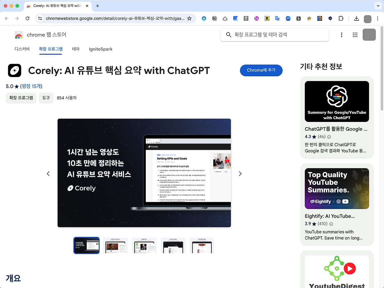 유튜브 영상을 보다가 바로 요약하고 싶다면, Corely의 크롬 브라우저 확장프로그램을 설치하는 것도 가능합니다. 유튜브 영상의 오른쪽 영역에 요약과 하이라이트 내용을 볼 수 있는 화면이 표시됩니다. 하이라이트의 내용도 요약 수준으로 표시되어 좀 더 자세히 내용을 보기 위해 하단의 “콘텐츠 보기”를 클릭하면 전체 요약을 볼 수 있네요.