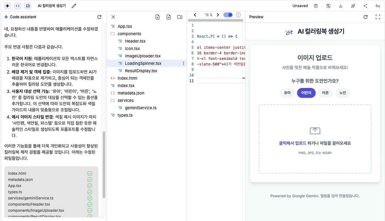 프롬프트 수행에 따른 변경된 어플리케이션의 모습은 아래와 같습니다. 한글로 제목부터 내용이 모두 작성되었고, 컬러링북 도안을 사용할 대상도 선택이 이제 가능합니다.